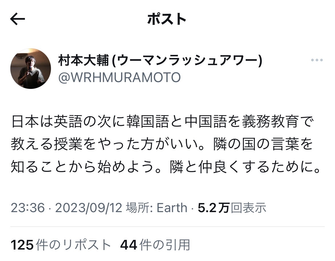 村本大輔さん「日本は英語の次に韓国語と中国語を義務教育で教える授業をやった方がいい」「隣と仲良くするために」 ツイートし反響
