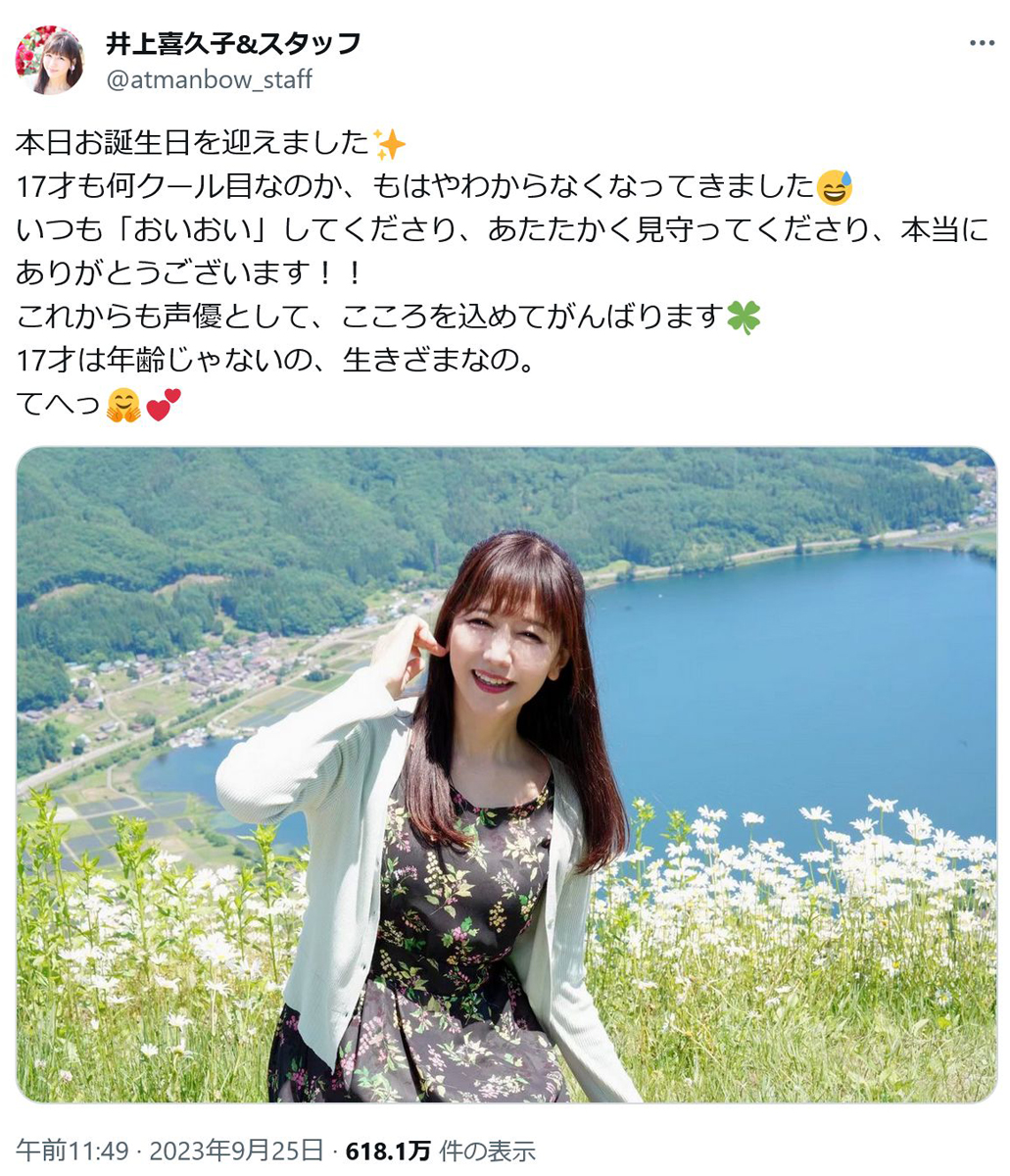 声優・井上喜久子さん「17才も何クール目なのか、もはやわからなくなってきました」 誕生日のツイートに祝福相次ぐ