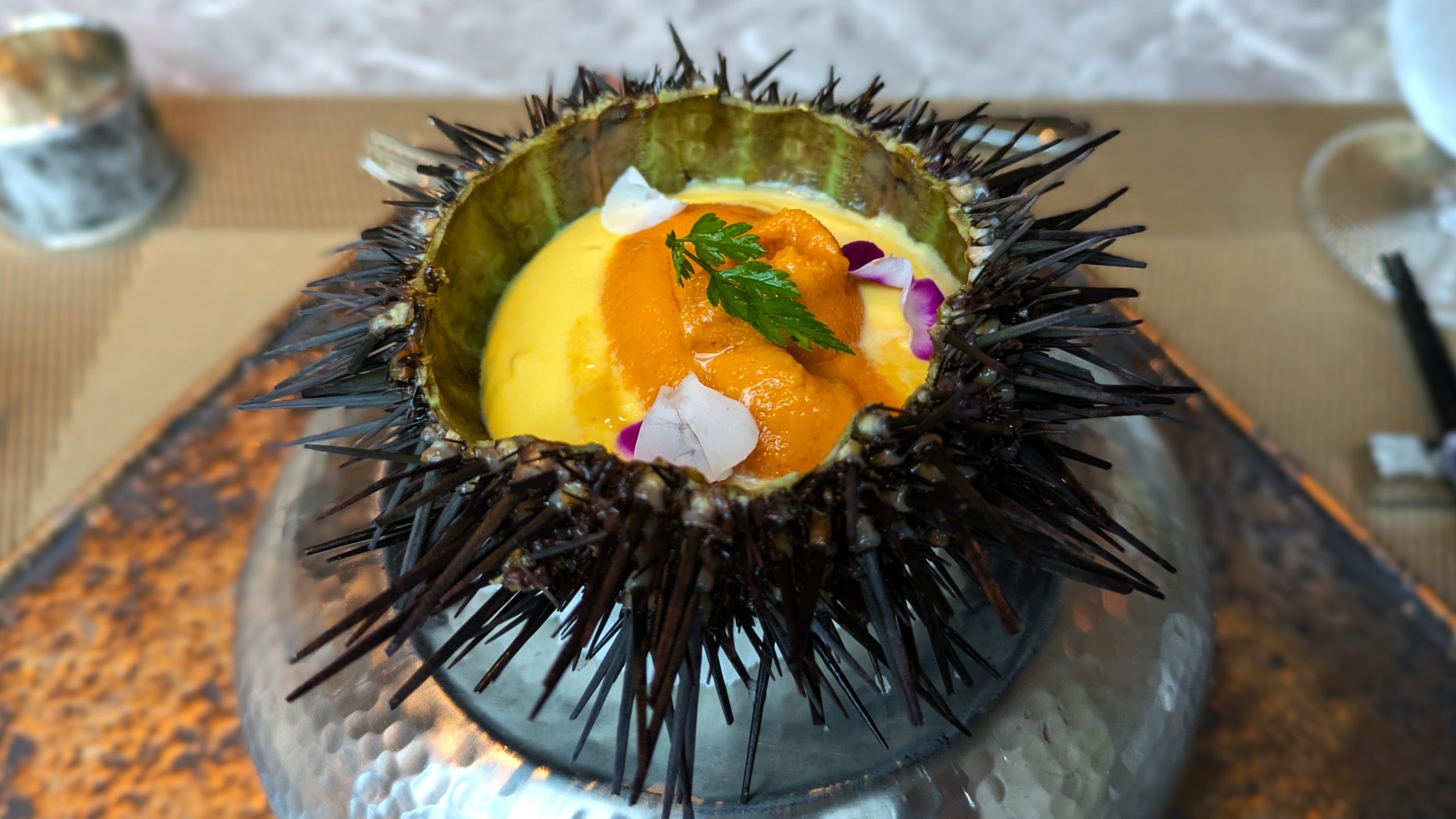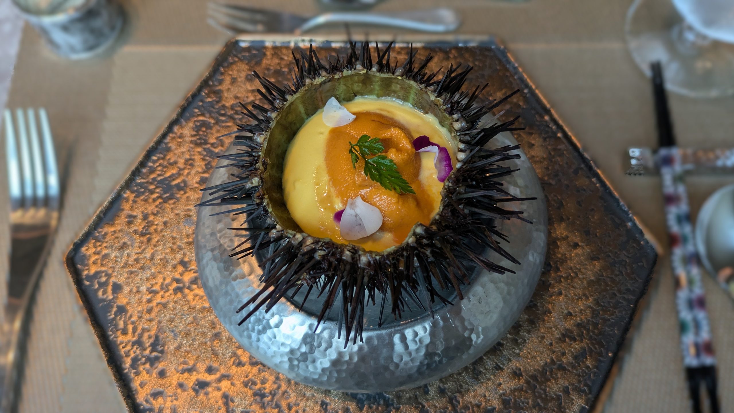 圧巻のウニ。鮮烈なビジュアル。人参のエスプーマとウニのハーモニーが絶品。