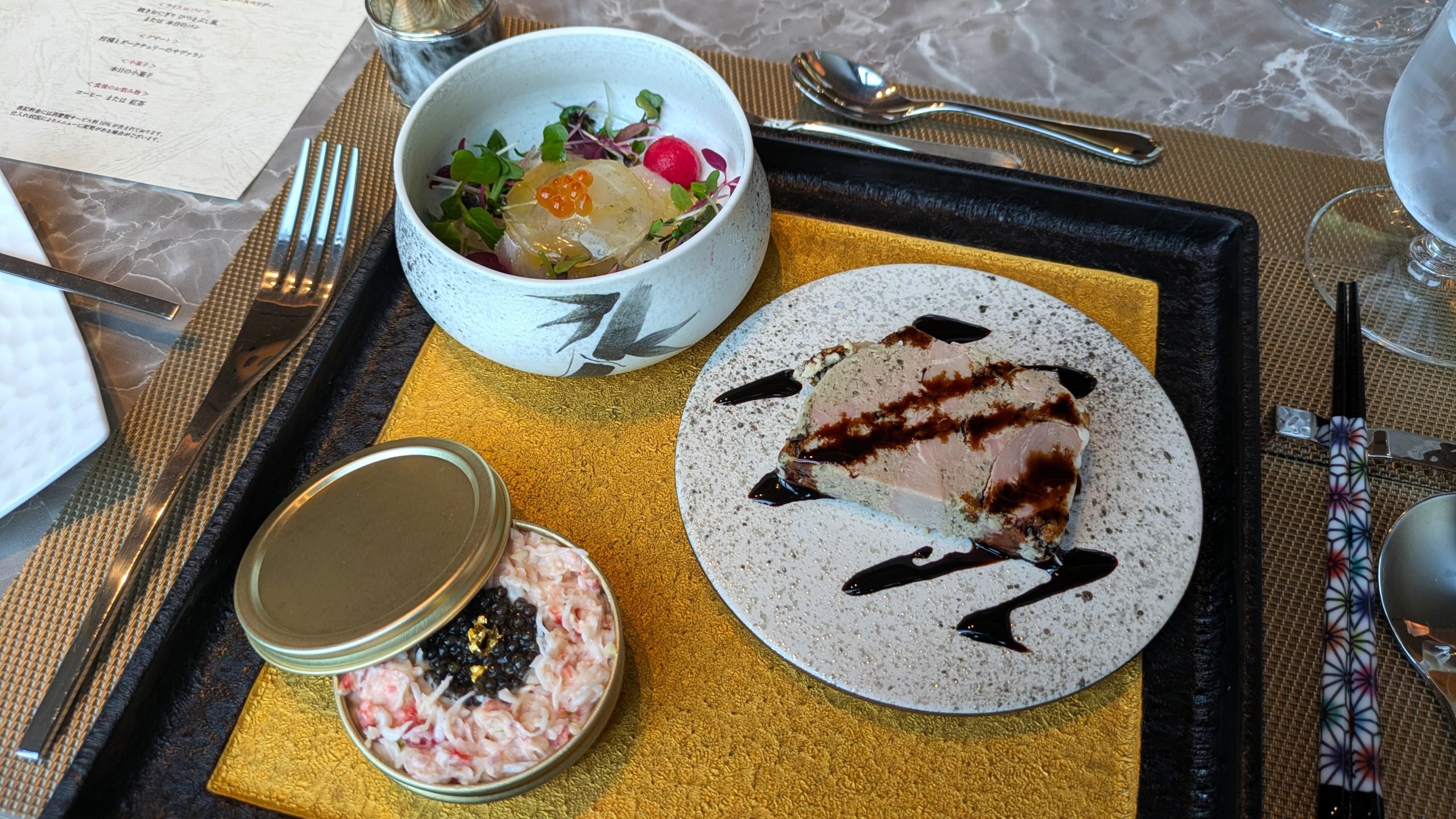 北海道産ハッカクのカルパッチョ、豚肉のパテドカンパーニュ、キャビアとタラバガニのマリネ――贅を尽くした前菜がひとつの皿に美しく並びます。ひと口ごとに異なる味わいと食感が楽しめ、視覚と味覚の両方で驚きと発見をもたらしてくれる一皿です。