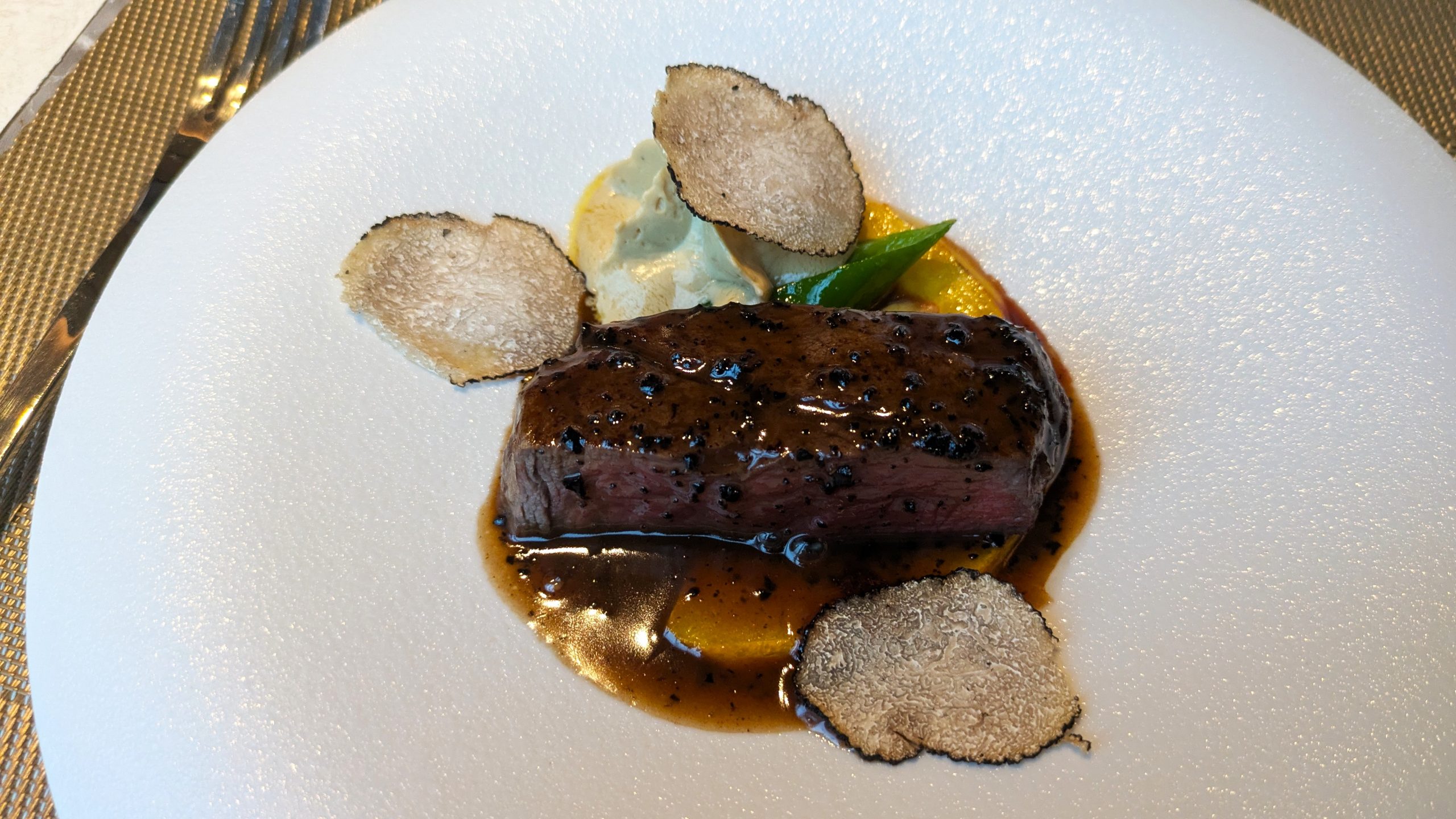 サマートリュフのスライスが華やかに添えられ、とろけるフォアグラのムースと赤身肉の旨みが絶妙に重なり合います。