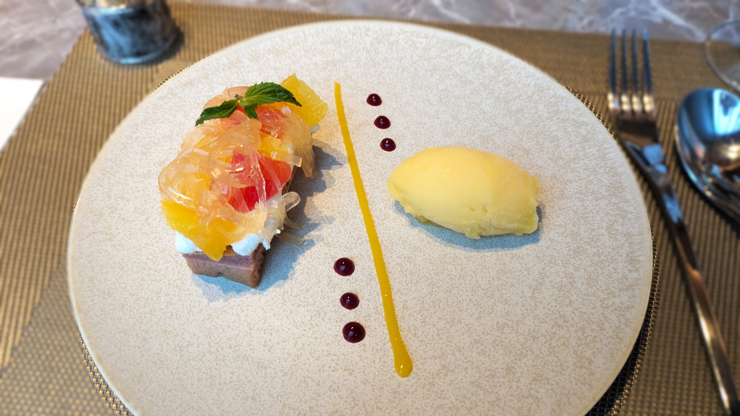 爽やかな酸味とほろ苦さが絶妙に調和したフランス流のデザート。見た目の美しさも相まって、食後の余韻を華やかに彩ります。
