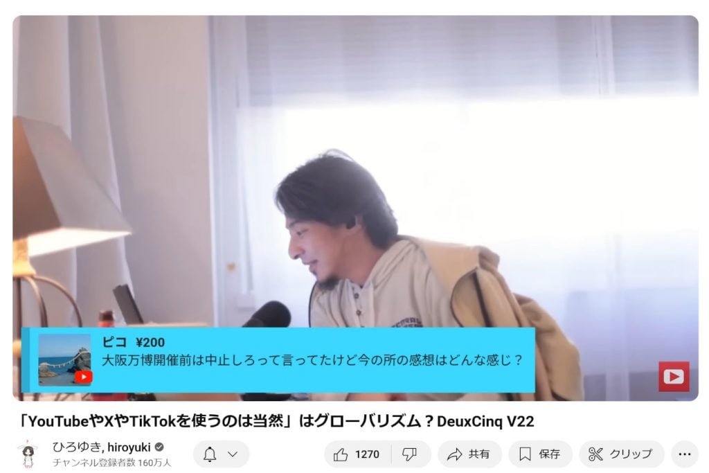 【大阪・関西万博】ひろゆきさん「大成功おめでとうございます!という感じです」 生配信で「開催前は中止しろって言ってたけど今の感想は」と聞かれ
