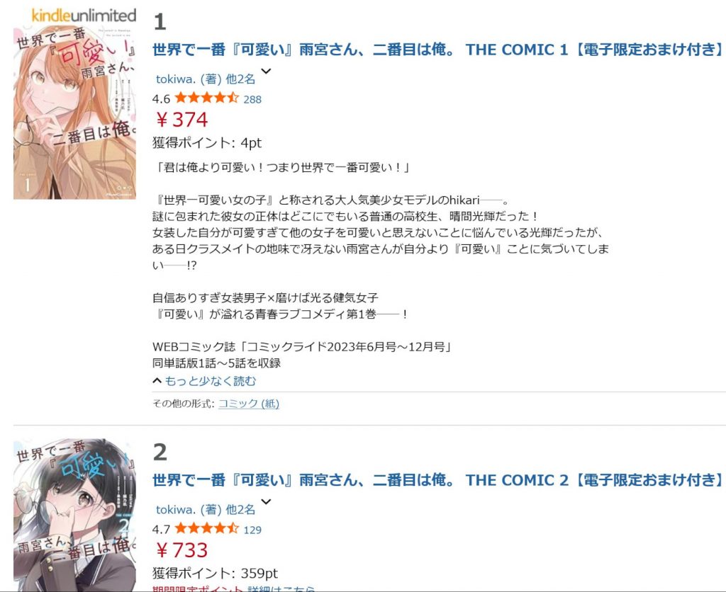 「世界で一番『可愛い』雨宮さん、二番目は俺。」コミカライズ作品の第1巻が半額!第2巻は50%のポイント還元中