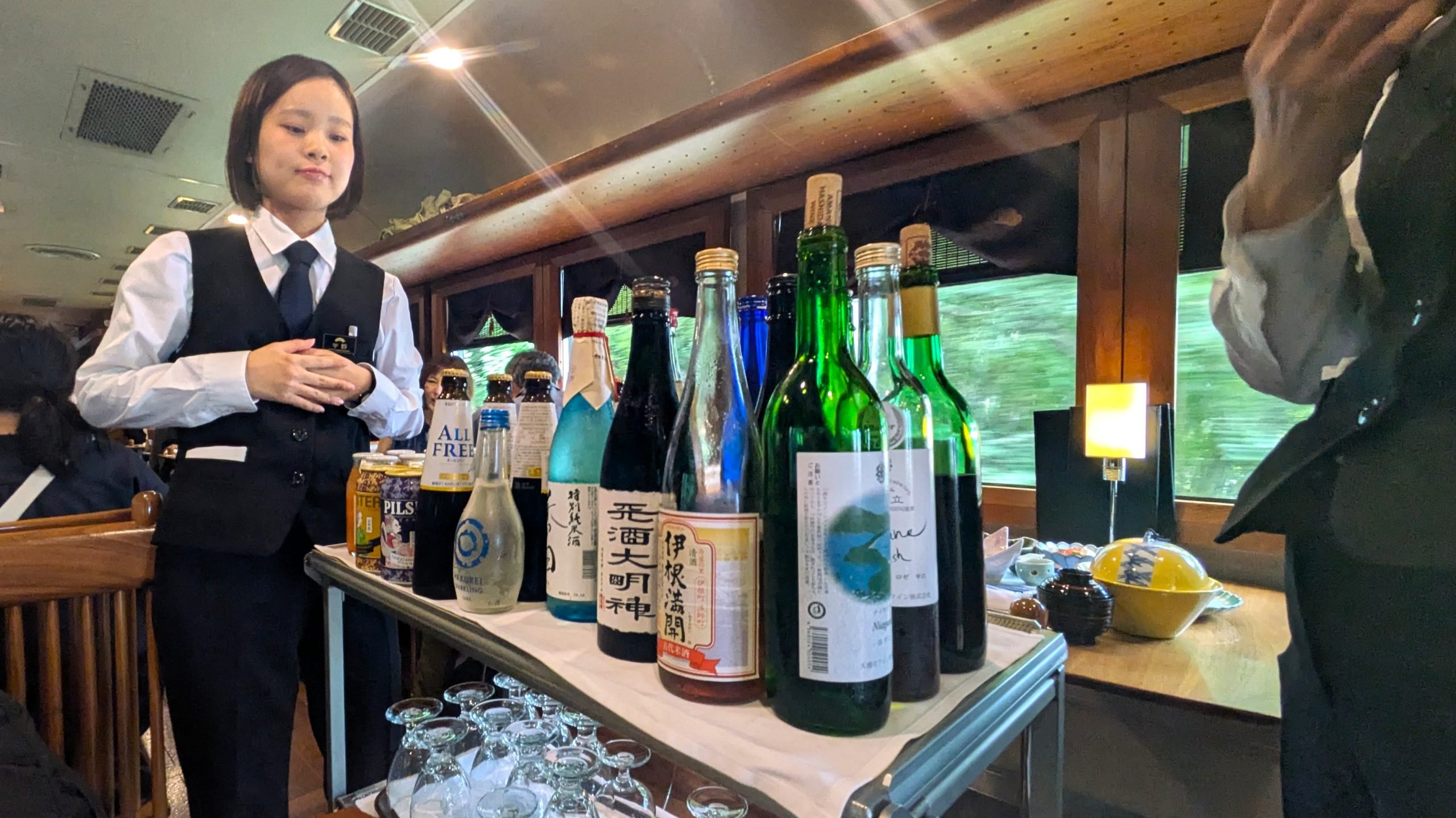 食事の途中には、地元産の日本酒やワイン、ソフトドリンクの車内販売も。