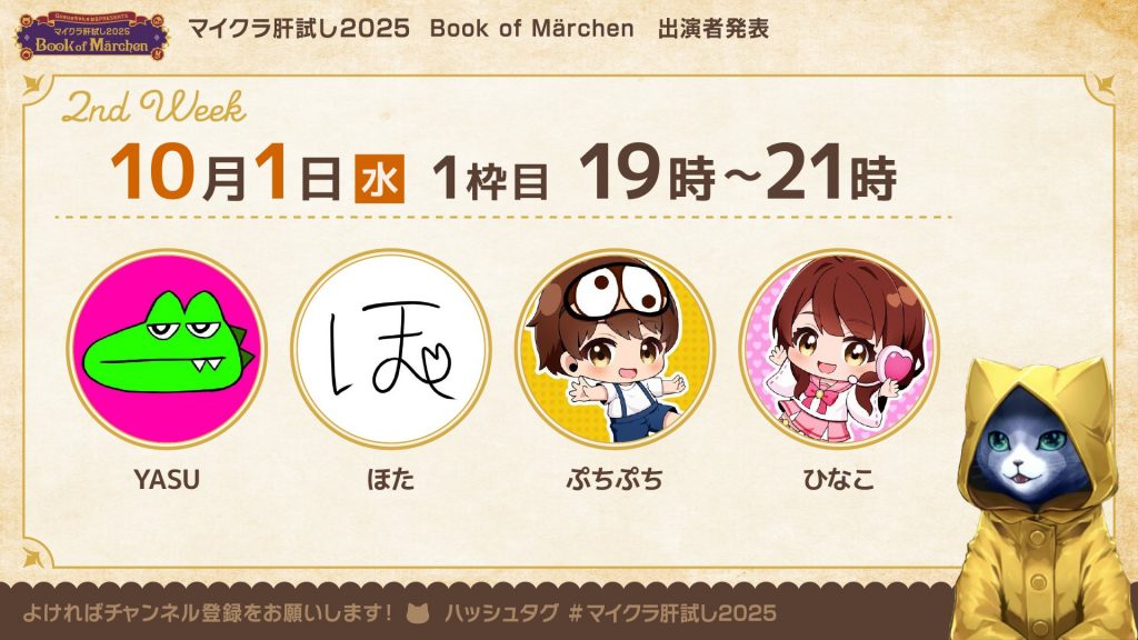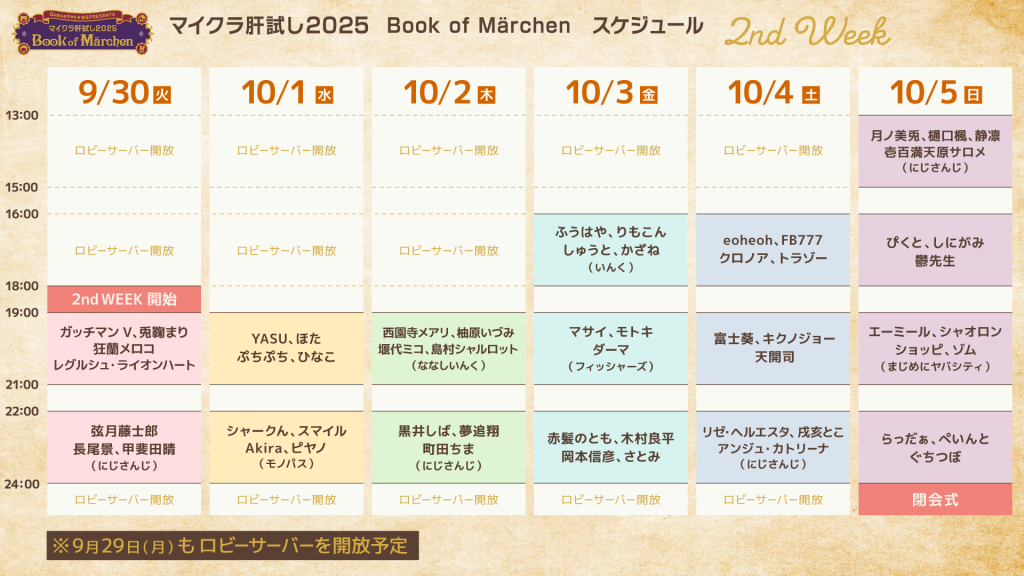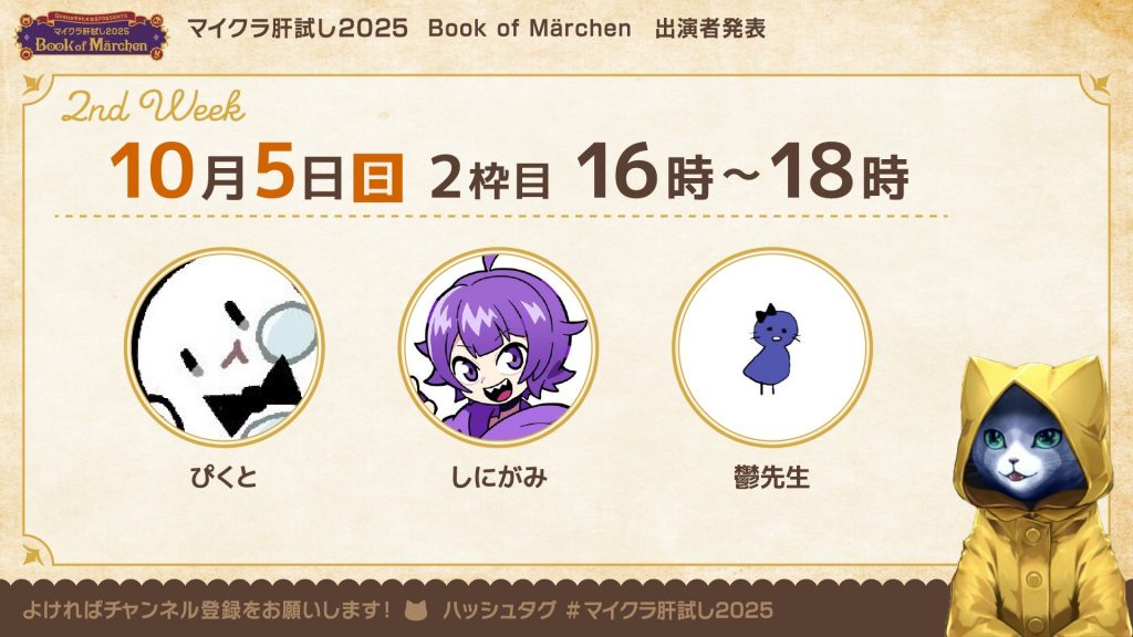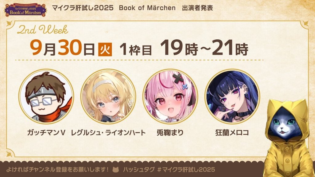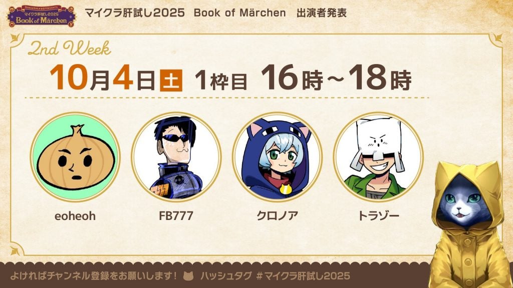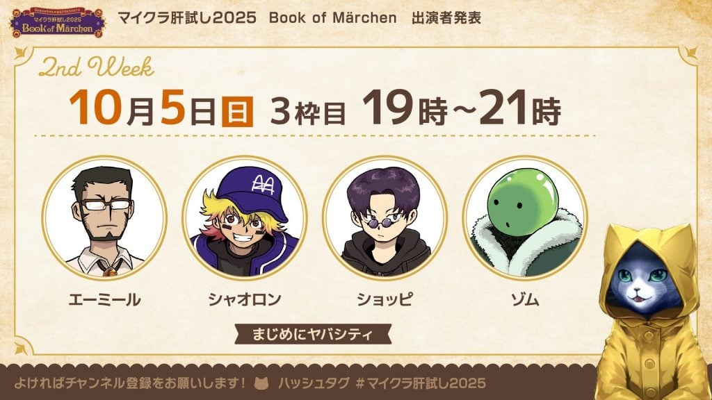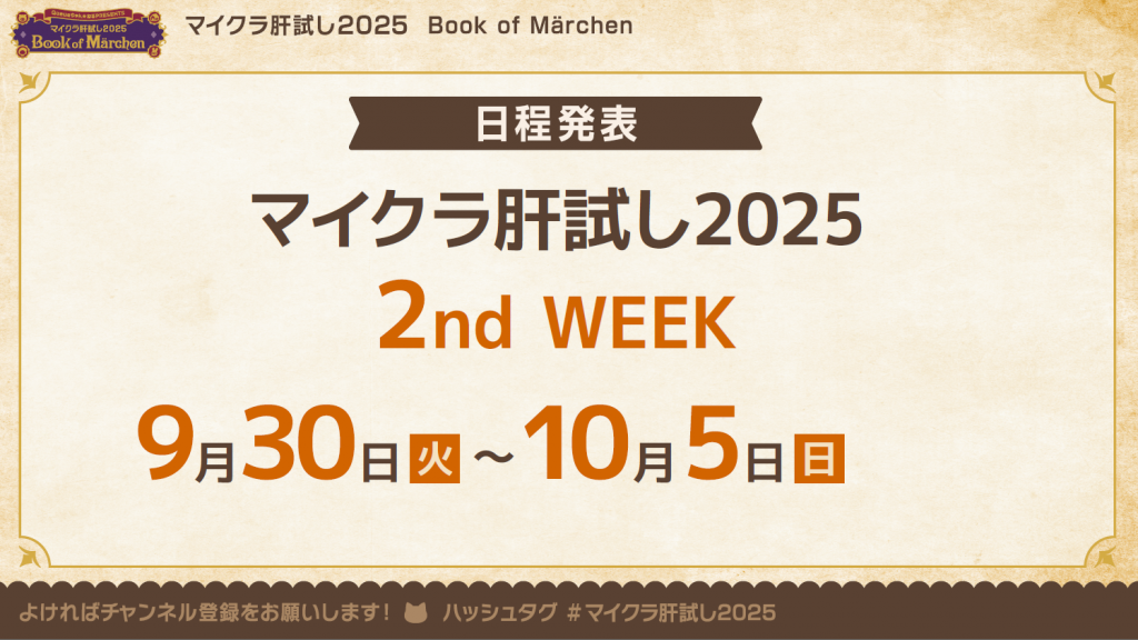 - 9/30~10/5開催! 超豪華ゲストが参戦するマイクラ肝試し2025 2nd Week「Book of Märchen」出演者タイムスケジュールをご紹介! 週刊チャンネルウォッチ9/29号