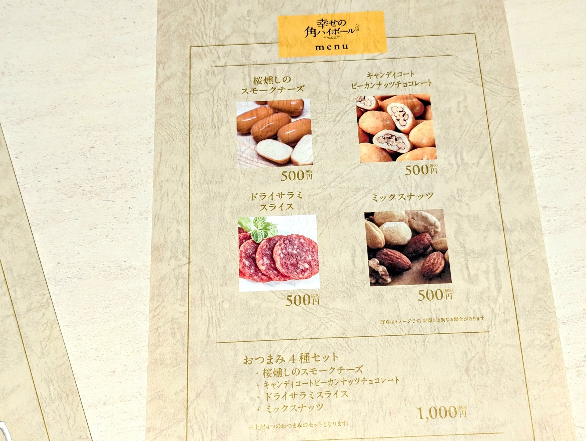 ▲角ハイボールにぴったりのおつまみ各種も500円。