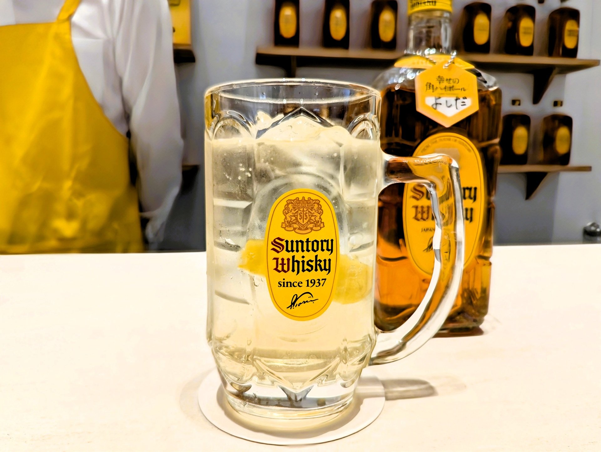 筆者が「いつもので」と注文して提供されたのは「黄金比」の角ハイボール。冷えたジョッキに氷がたっぷり入って、ソーダがシュワシュワと弾けて、レモンがふわりと香ります。