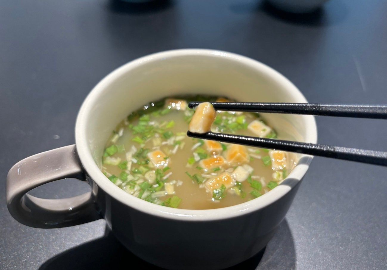 ……え、これ本当に同じかつおだし? と混乱。ガツンとくる赤味噌の濃厚なコクに全く負けていない、だしの力強い存在感に驚愕。豆腐とわかめというシンプルな具が、この重厚な味のハーモニーを完璧にまとめています。白米が無限に食べられそうな、もはや「おかず」レベルの一杯です。