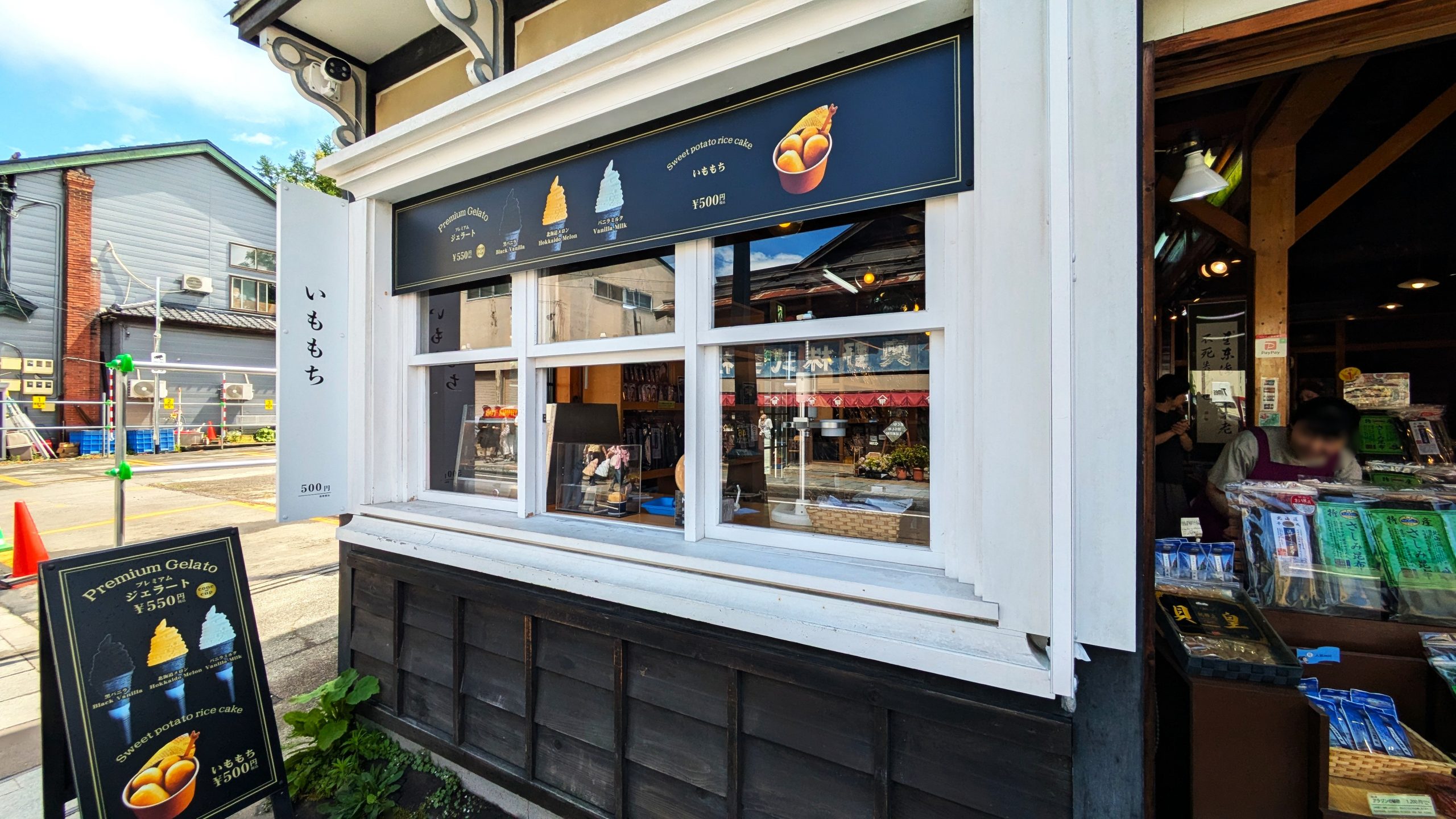 堺町中央店のもう一つの名物が、プレミアムジェラートの黒バニラ味。さらに「いももち」まで販売しているという、なんとも自由なラインアップ。