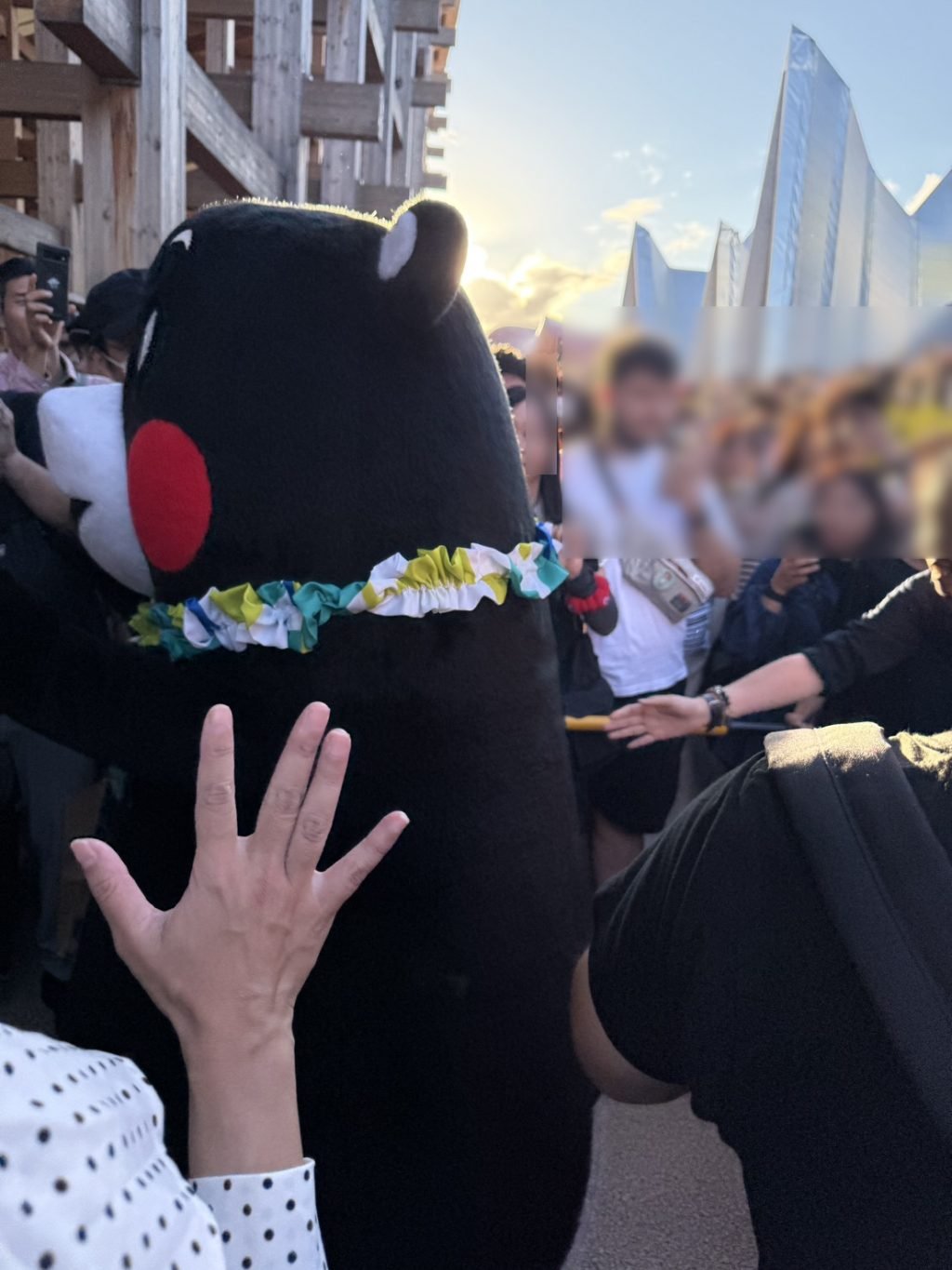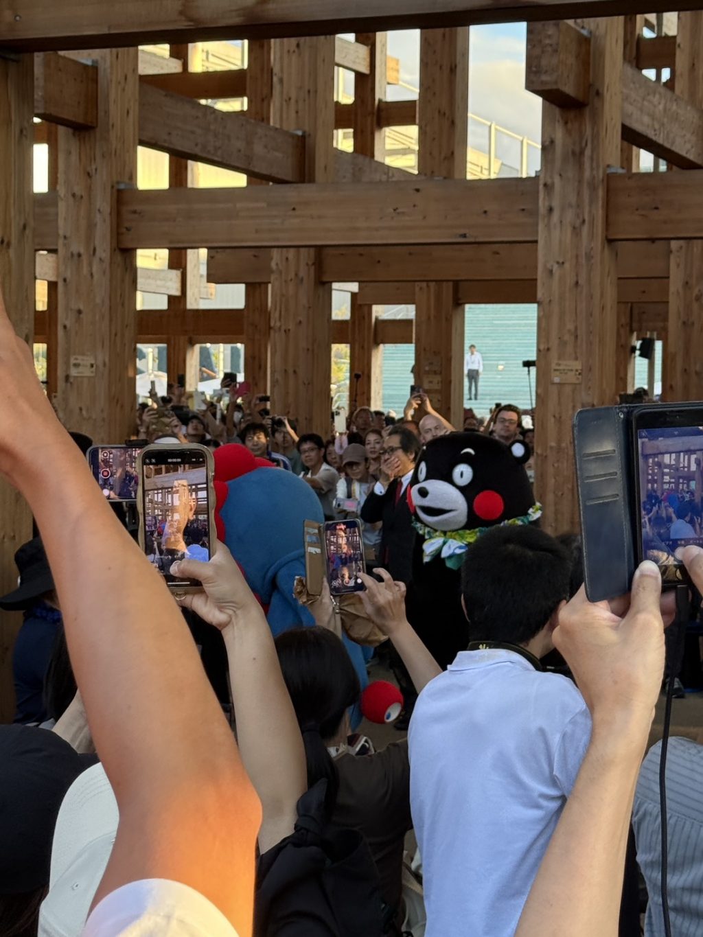 TECHWORLDの近くで人が押し合う中、係員数人がロープを使って道を作り「通ります、すみません」とやっていて、どんなVIPが登場するのかと思ったら「くまモン」が大屋根リング下へと。その後ミャクミャクと合流してはしゃいでいた。