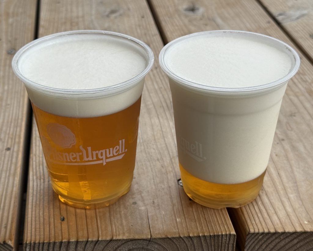 日本館を出た後、大屋根リングを散策し、お昼どきにはチェコ館で普通の注ぎ方のものと泡いっぱいの「ミルコ」を購入し飲み比べ。1250円×2。
