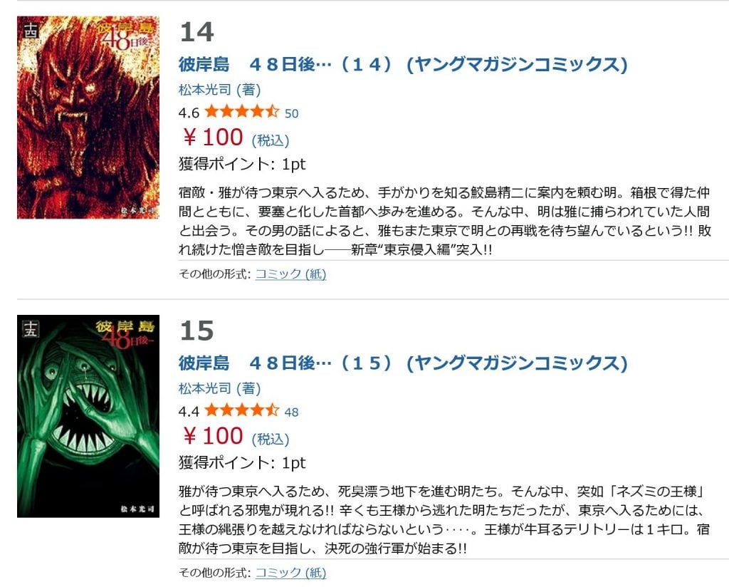 10月14日現在、AmazonKindleなどの電子書籍サイトでは「彼岸島」全33巻、「彼岸島 最後の47日間」全16巻が全巻100円!「彼岸島 48日後…」も1~15巻が100円となっている。