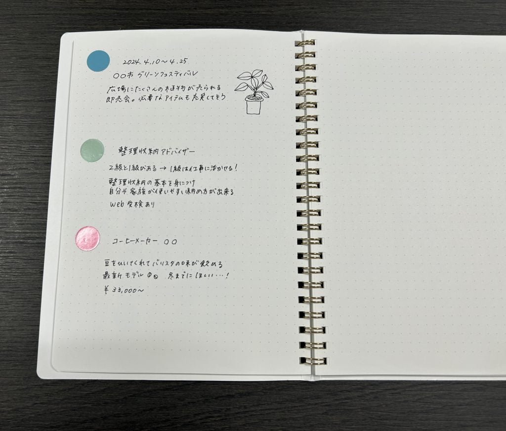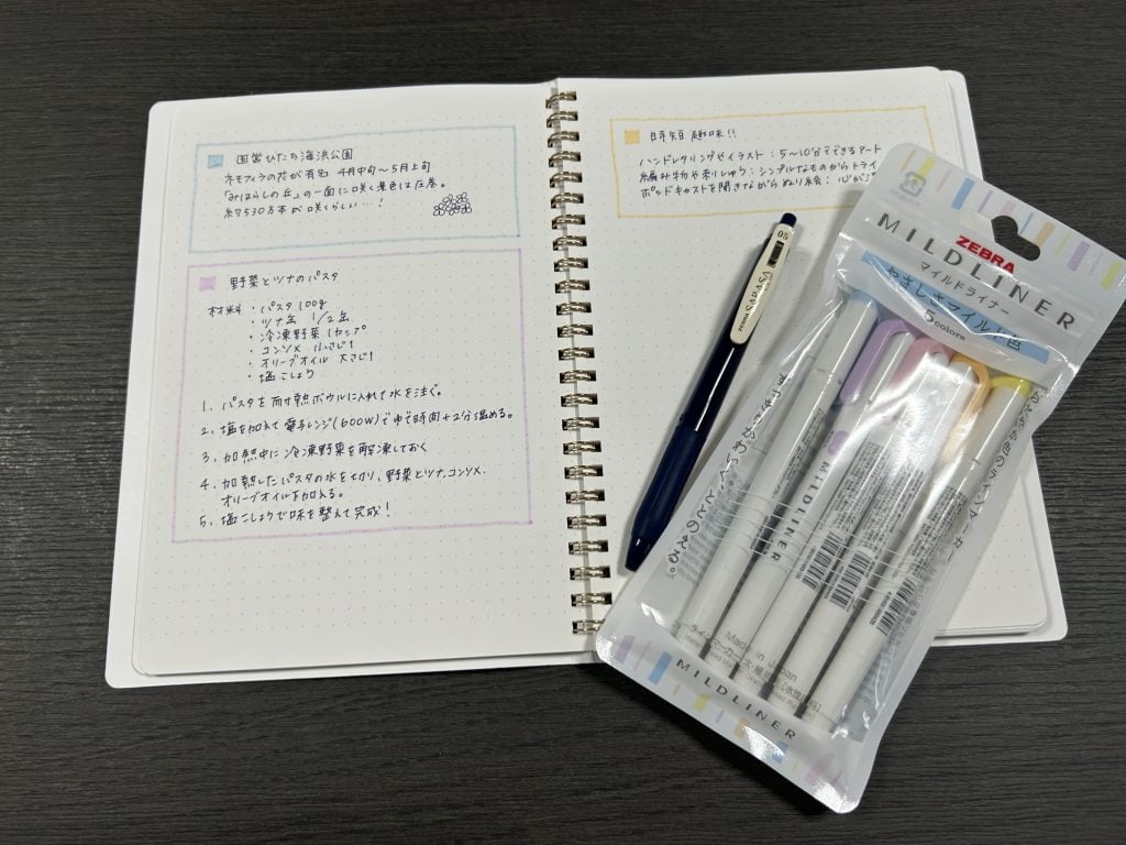 やさしい色味のマーカーペン「マイルドライナー」でカテゴリ分け。自分ルールで色を決めておくとノートが見返しやすくなります。