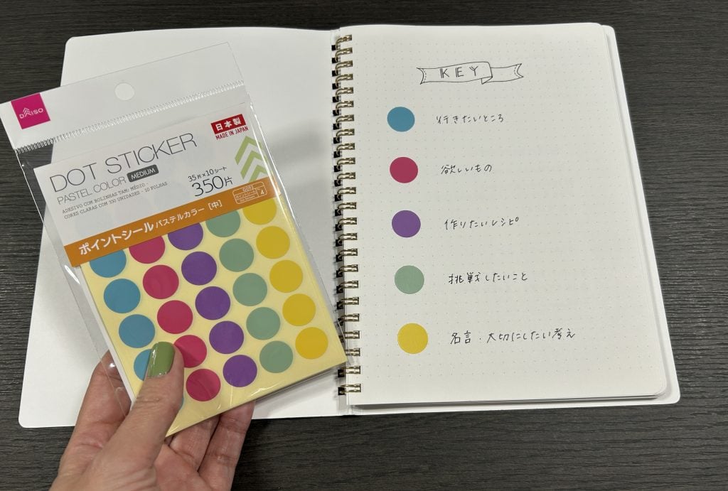 ダイソーなど100円均一で手軽に手に入る丸シールを活用。まず最初のページに“KEY”と呼ばれる目次を記載。カテゴリごとにページを整理します。