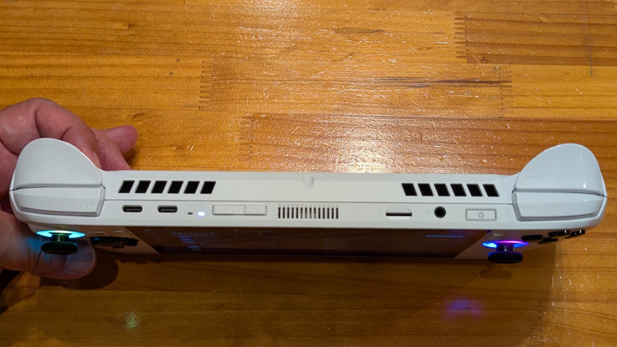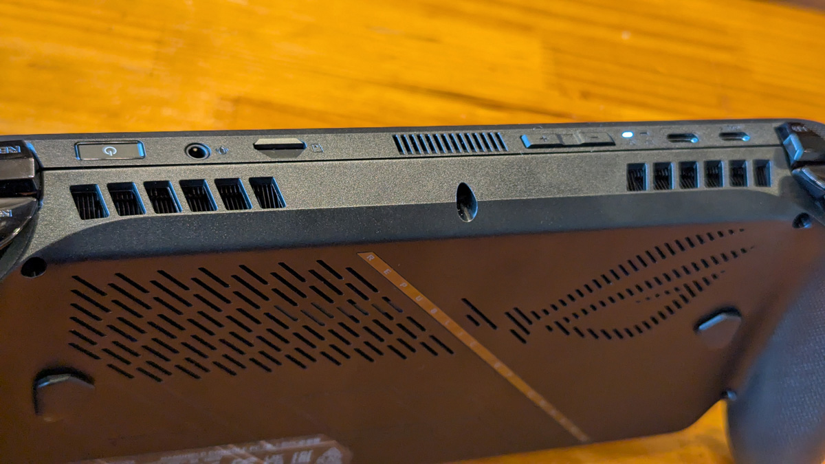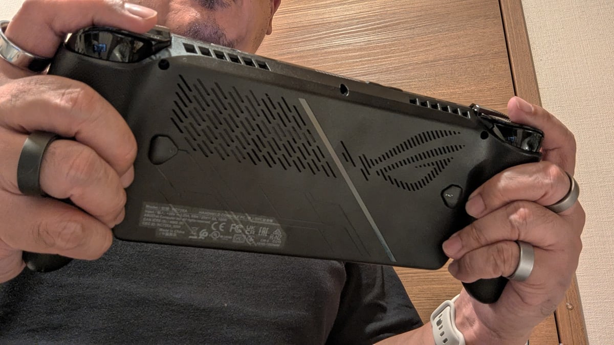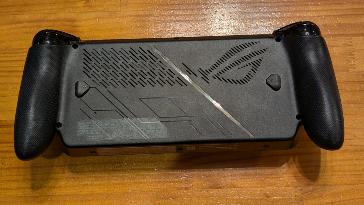 ベースとなるROG Allyの個性もしっかり主張しています。背面のスリットで描かれるROGマークとメタリックなスラッシュパターン、小型で押しやすくなったカスタマイズ可能な背面ボタンはROG Ally伝統のデザイン。