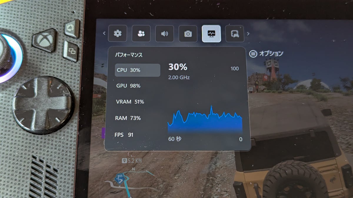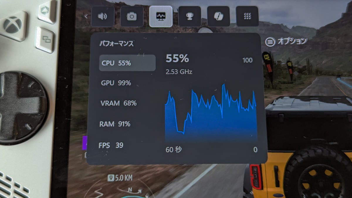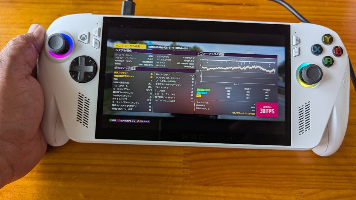 2モデルでパフォーマンスにはどれぐらいの差があるのでしょうか。電源に接続してForza Horizon 5のベンチマークを実行したところ、ROG Xbox Allyの結果は38FPSでした。ターボモード、1080p、120Hzの条件で実行しています。ゲーム中にGame Barで確認したパフォーマンスも39FPS程度で、Forza Horizon 5では安定して40FPS弱のパフォーマンスを発揮している模様。