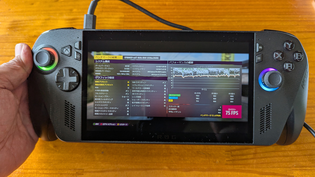 ROG Xbox Ally Xのターボモード、1080p、120Hzの条件でのベンチマーク結果は75FPS。ゲーム中では91FPSという数字も出ており、ROG Xbox Allyの2倍近くのパフォーマンスを発揮できるものとみられます。