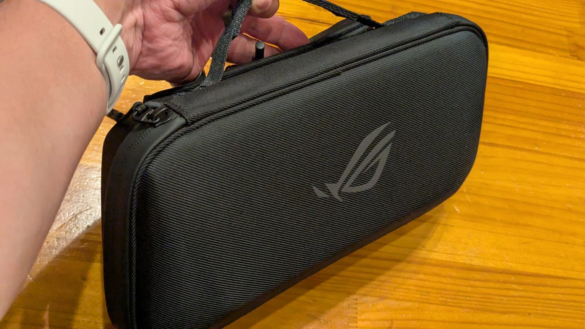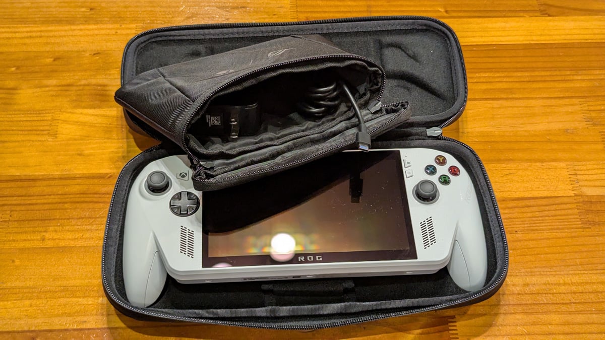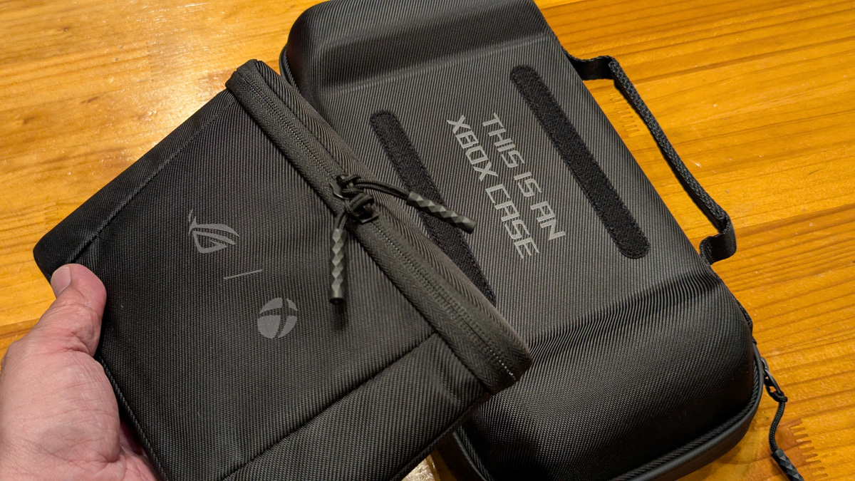 本体と同時発売のアクセサリーも触ってみました。「ROG Xbox Ally (2-in-1) Premium Case」は、スタンドとしても使える携帯用ケース。本体に付属する65WのACアダプター専用に設計された収納ポケットはケース背面で脱着可能で、収納ポケットを外して本体のみをスリムに持ち運ぶこともできます。希望小売価格は7980円(税込)。