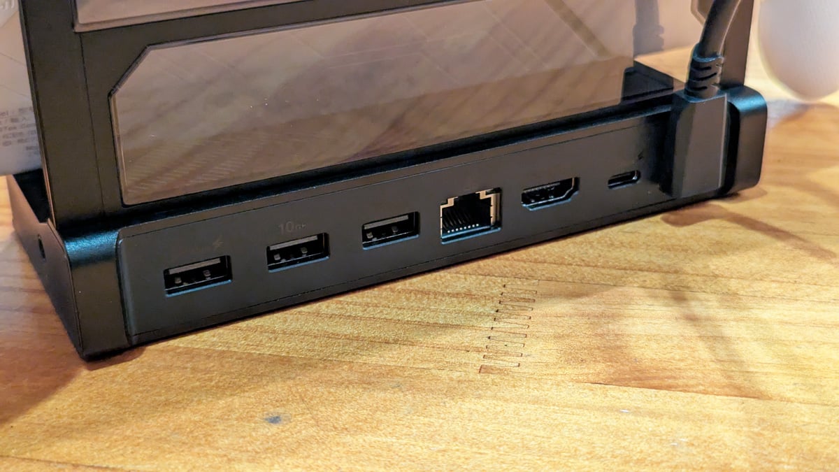 「ROG Bulwark Dock DG300」は、ROG Xbox Allyシリーズやスマホ、携帯ゲーム機、ノートPCとUSB-Cケーブル1本で接続して充電や外部デバイスとの接続に利用できるドッキングステーション。ポート構成はUSB 3.2 Gen2 Type-Cポート、USB 3.2 Gen2 Type-Aポート3基、LANポート、4K/144Hzと8K/30Hzに対応するHDMI 2.1ポート、3.5mmオーディオジャック。合計最大100W出力に対応します。アップストリームは転送速度10GbpsでPD 100Wに対応するUSB 3.2 Gen2 Type-C。希望小売価格は2万3980円(税込)です。