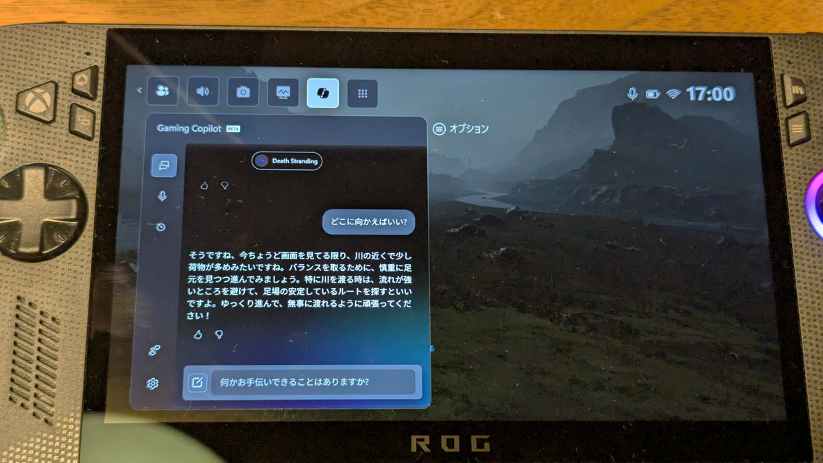 ROG Xbox Allyシリーズでは、ゲームに特化したAI機能が利用できるのもユニークなポイント。Game Barにある「Gaming Copilot(ベータ)」では、テキストや音声のチャットでAIにゲーム攻略の相談ができるサービスを提供します。
