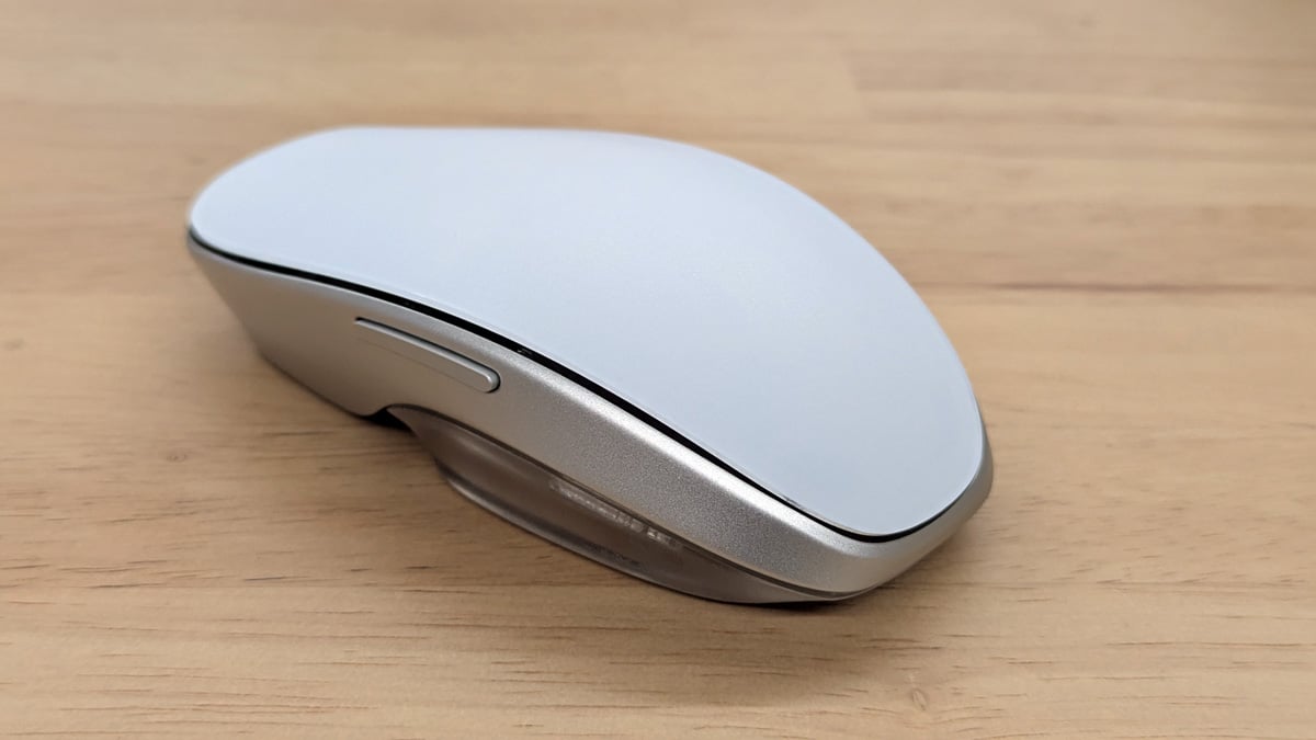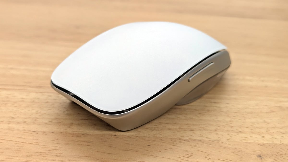 天面に微細なテクスチャーを施した曲面強化ガラスを使用し、側面の物理ボタンを除きマウスボタンをなくした美しいデザインのマウス。ボディには削り出しのアルミニウムを採用しています。