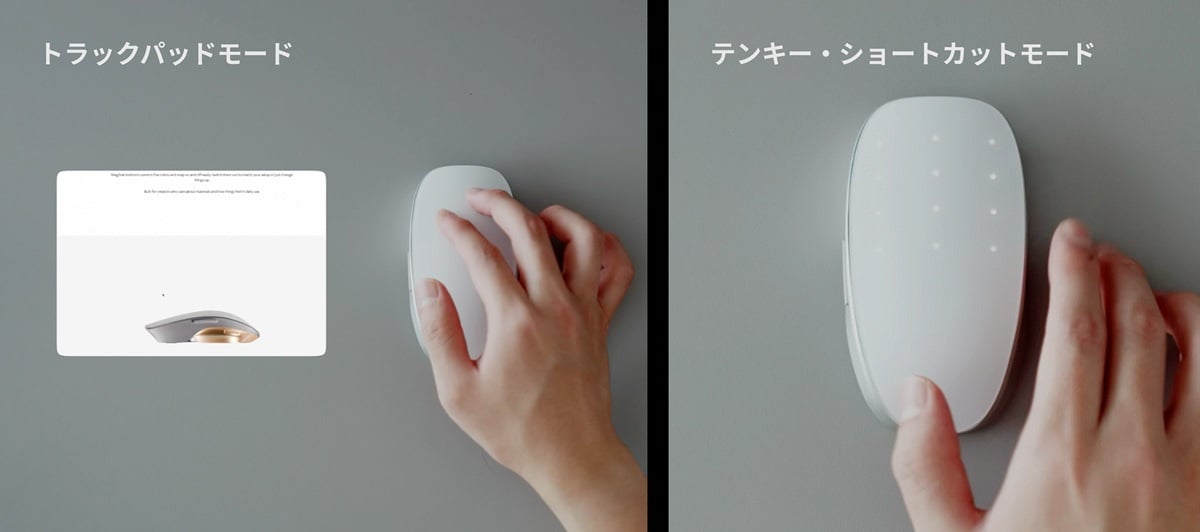操作モードを切り替えることで、天面はスワイプや2本指操作ができるトラックパッドになる他、天面に12個のLEDでハイライトしたボタンをタップすることでテンキーとして利用可能。