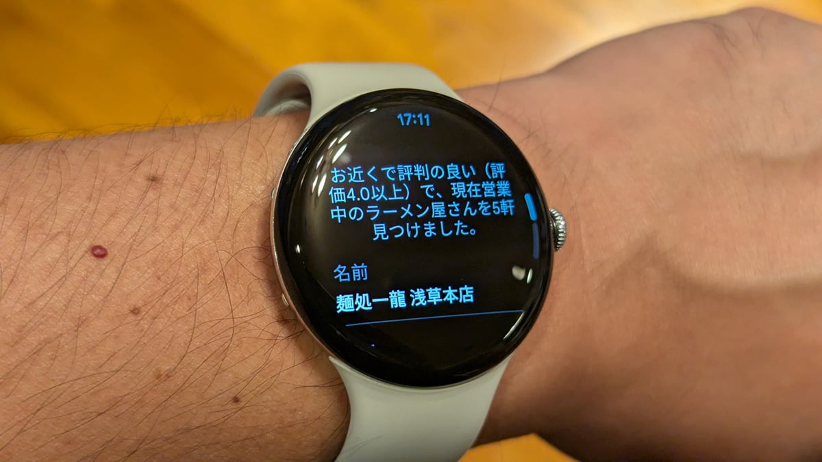 質問に回答するだけでなく、Googleサービスとの連携が強力に。「10月11日の予定は?」と聞くとGoogleカレンダーから予定を表示したり、「来週の天気は?」と聞くと天気アプリから回答したり、「近くの評判のいいラーメン屋さんは?」と聞くとGoogleマップから食べログ評価の高いラーメン屋をリスト表示し、さらにラーメン屋の場所を聞くことでスマホのGoogleマップと連携して道順を案内してくれます。これらの動作はライブ配信番組「ガジェット通信ライブ」のアーカイブ動画から確認できます。