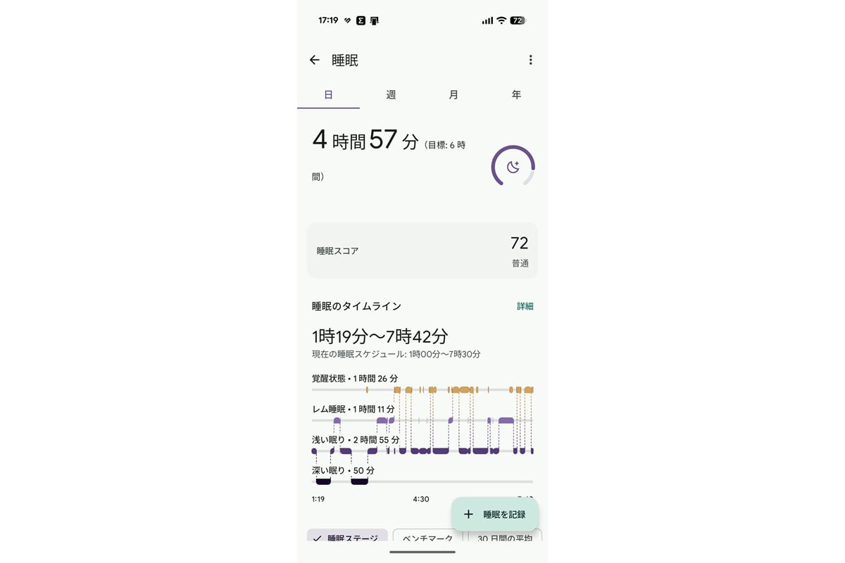 機械学習モデルの活用により、睡眠計測の精度が18%向上。たとえばスマートリングなど他のデバイスで5時間半と計測された睡眠が、Pixel Watch 4では5時間未満と計測され、睡眠中の細かい覚醒状態をかなり正確にトラッキングできていることが分かります。