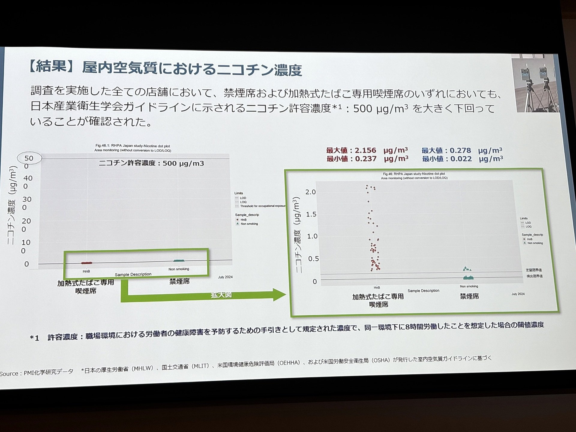 フィリップ モリス インターナショナル 東アジア&オーストラリア地域 サイエンティフィック・エンゲージメント責任者のクー イヴォンヌ博士は、「換気基準が守られている施設において、従業員の通常業務中におけるニコチン曝露の有意な増加を防ぐうえでは非常に有効であることが分かりました」と結論付けている。