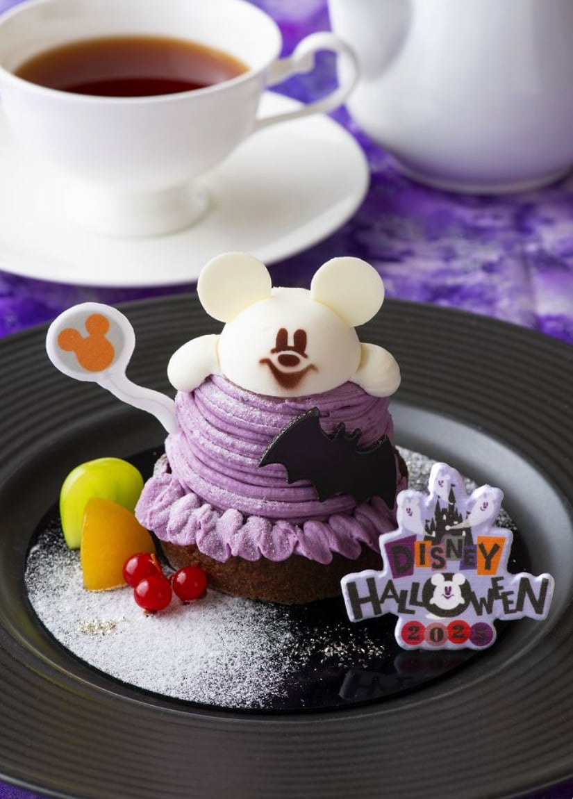 ディズニーランドホテル「ハイピリオン・ラウンジ」でいただける“ディズニー・ハロウィーン”ケーキセットは、無花果のコンフィテュール入り紫芋クリームとナッツのタルト、コーヒーまたは紅茶が選べるメニュー。