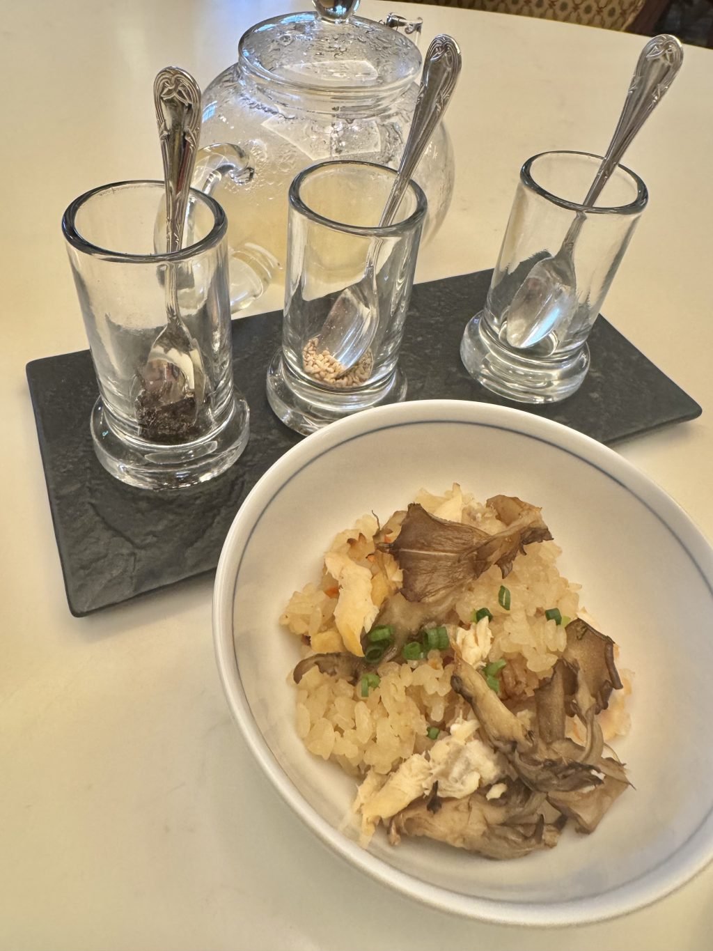 「鮭と舞茸の炊き込みご飯」はそのままでもギュッとした旨みを感じられる逸品なのですが、わさびなど3種のコンディメント(薬味)や出汁をかけていただくのも最高でした!