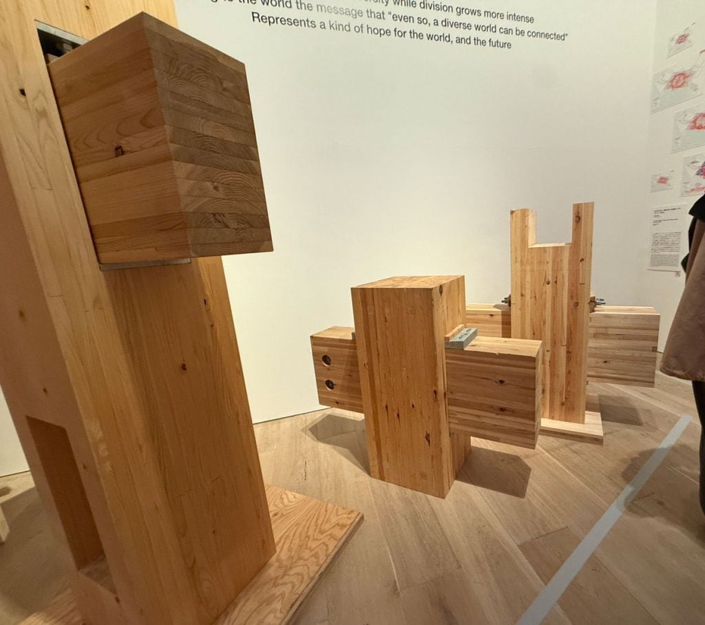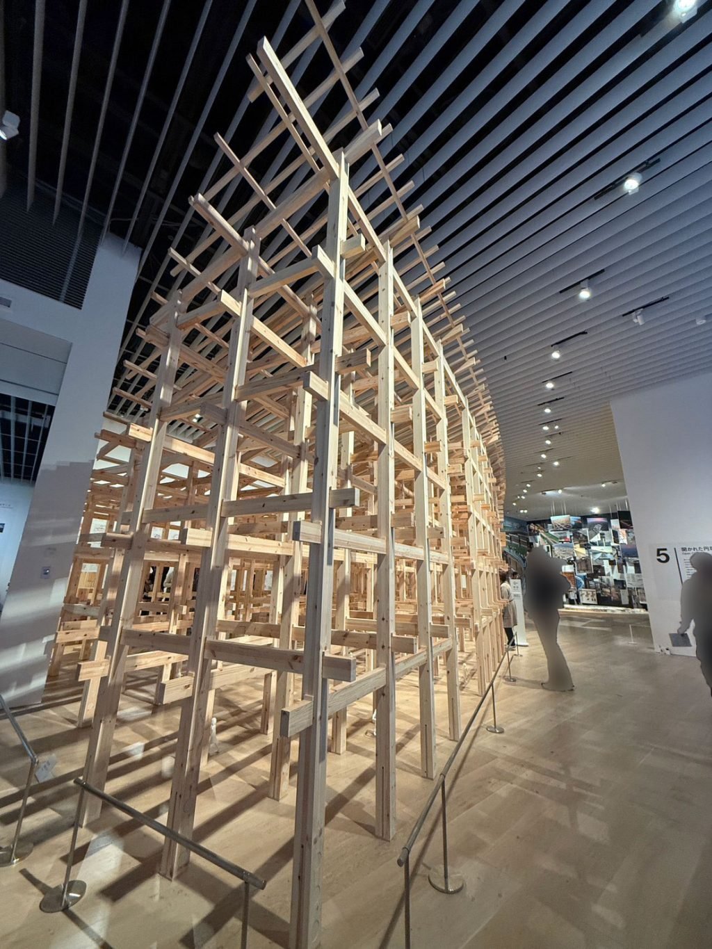 現在、六本木の森美術館で開催中の個展「藤本壮介の建築:原初・未来・森」では、その大屋根リングの5分の1スケールの部分模型が展示されている。