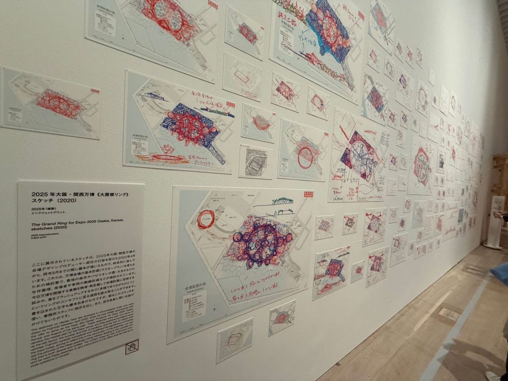 大屋根リングの実物大モックや、完成に至るまでのスケッチなども大変興味深い。