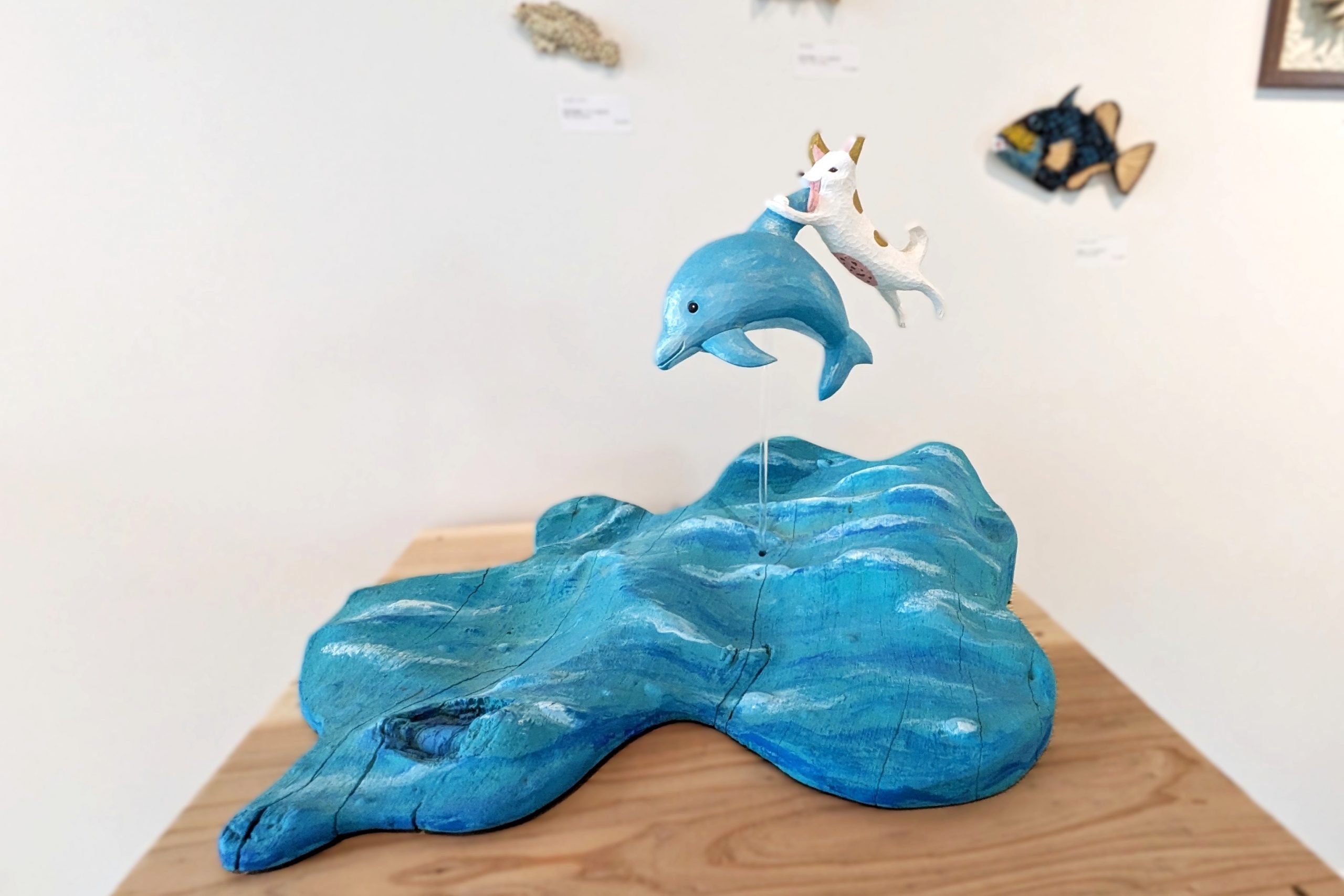 こちらは安本篤人さんの木彫り作品「世界一の海で」。犬とイルカの愛らしい姿の中に、力強い生命力を感じます。
