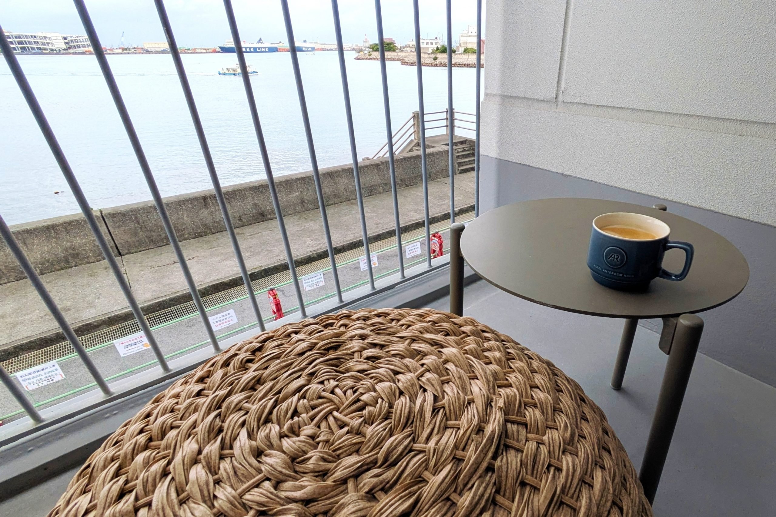 深い青のマグカップと海の景色は相性抜群。テラスで過ごすひとときも格別。