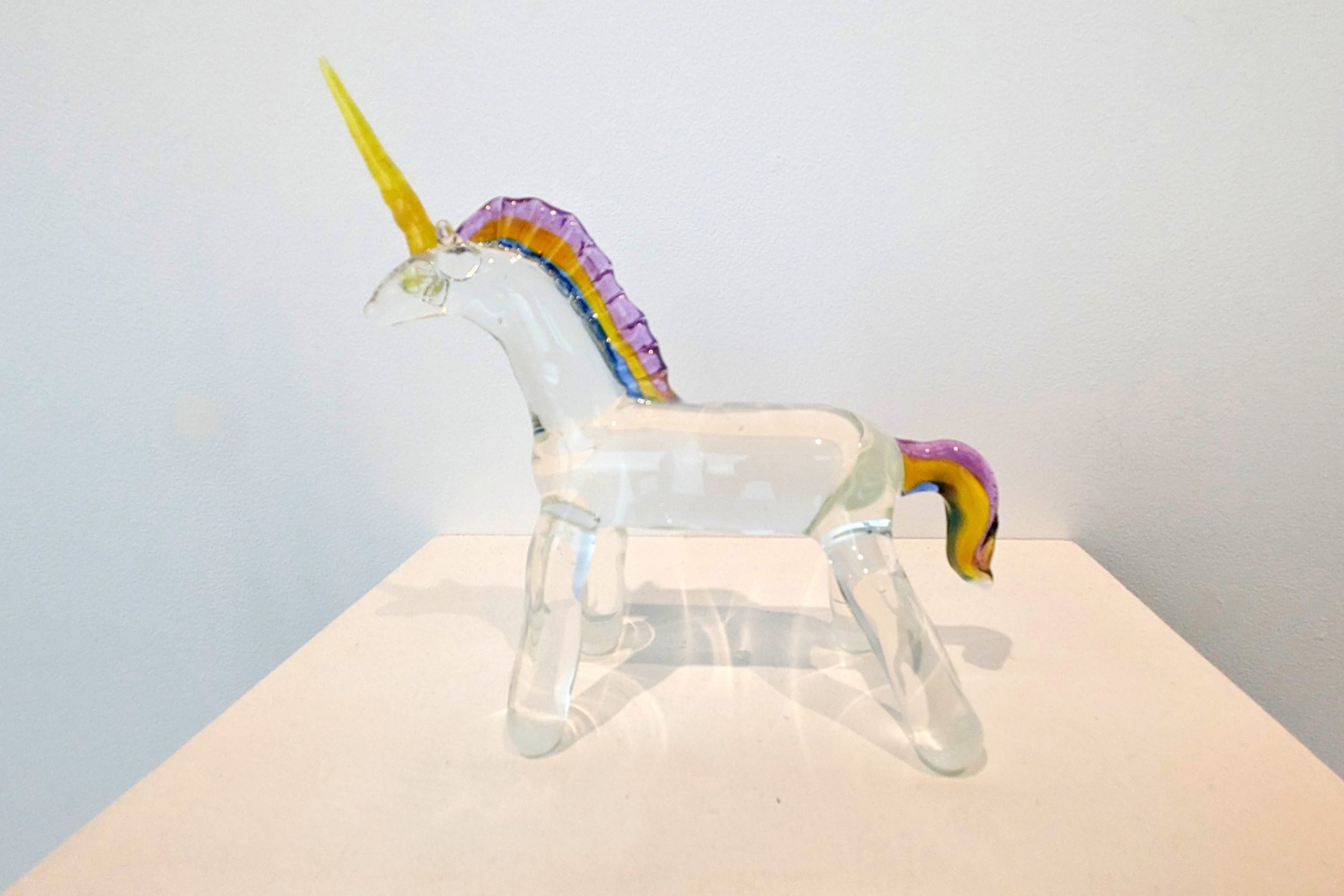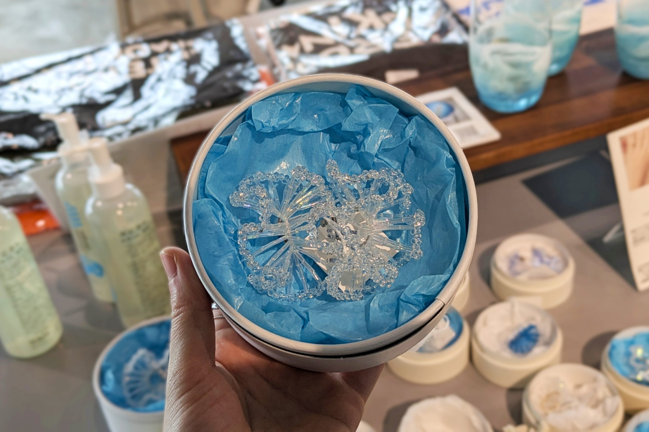 津田亮さんのガラス作品は、窓から差し込む光でキラキラと神秘的な輝きを放っていました。