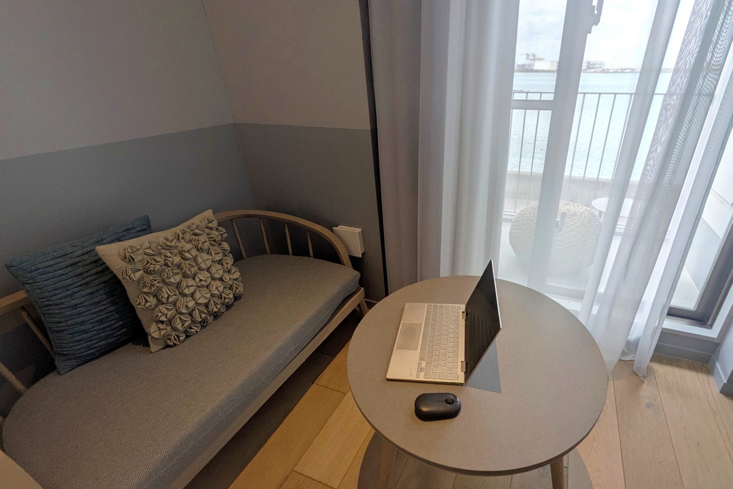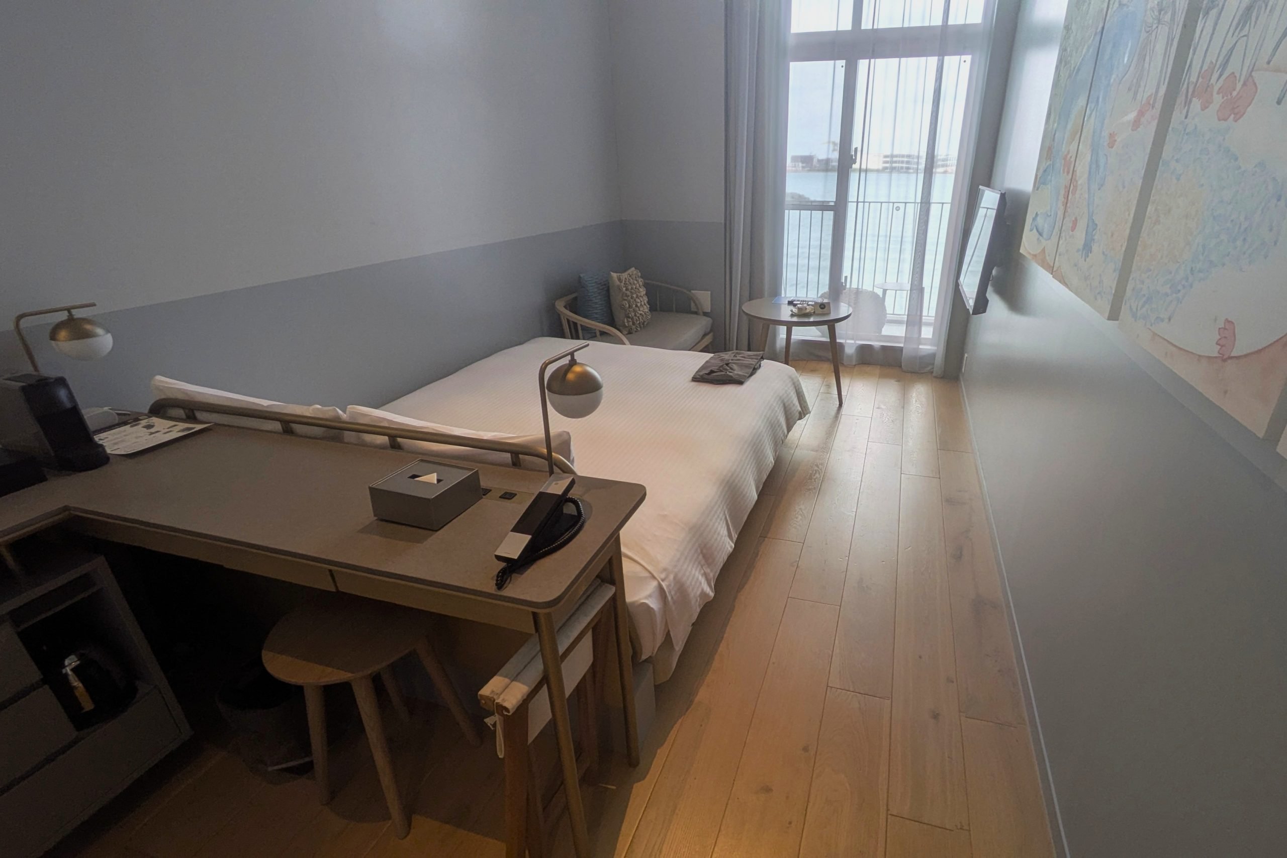 客室はすべて港が望める“ハーバービュー仕様”。天井が高く、開放的で大きな窓から柔らかな光が差し込みます。