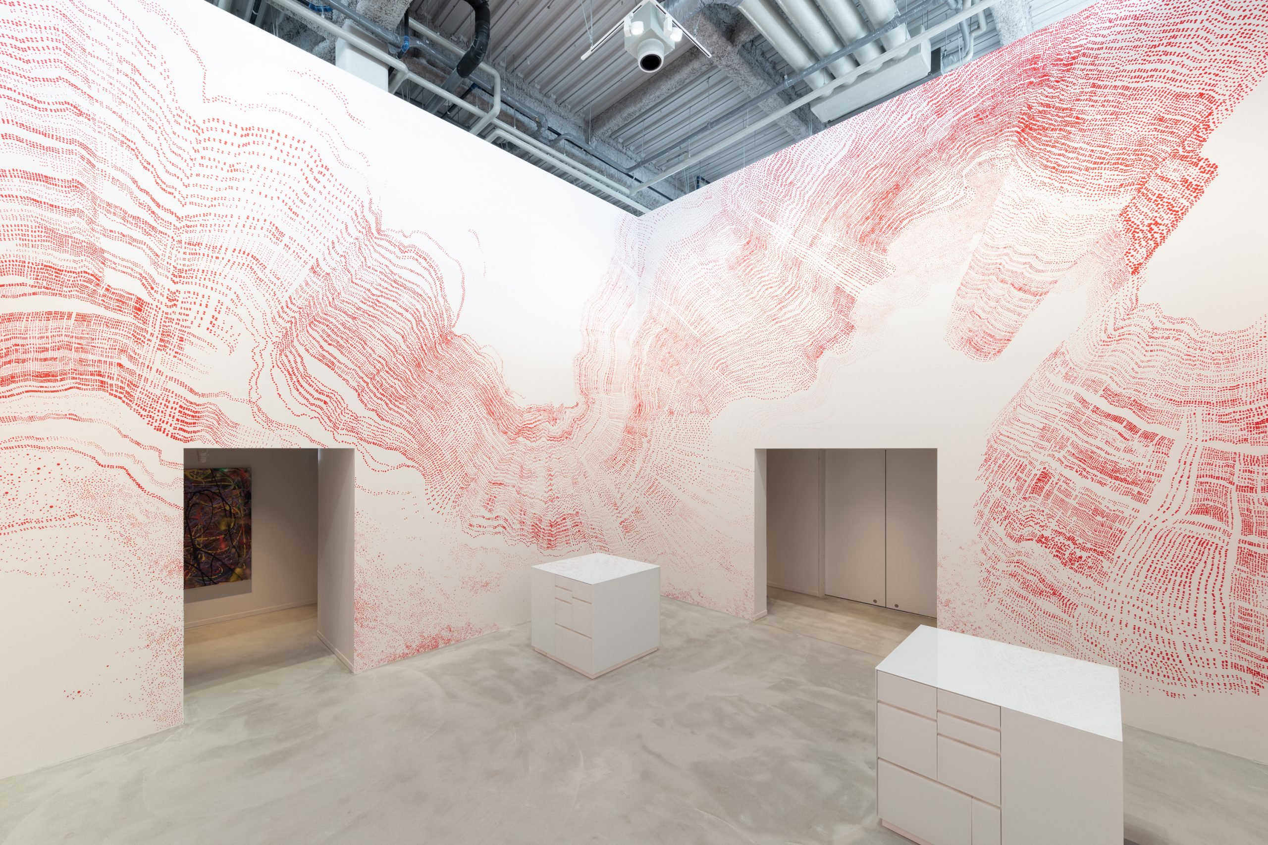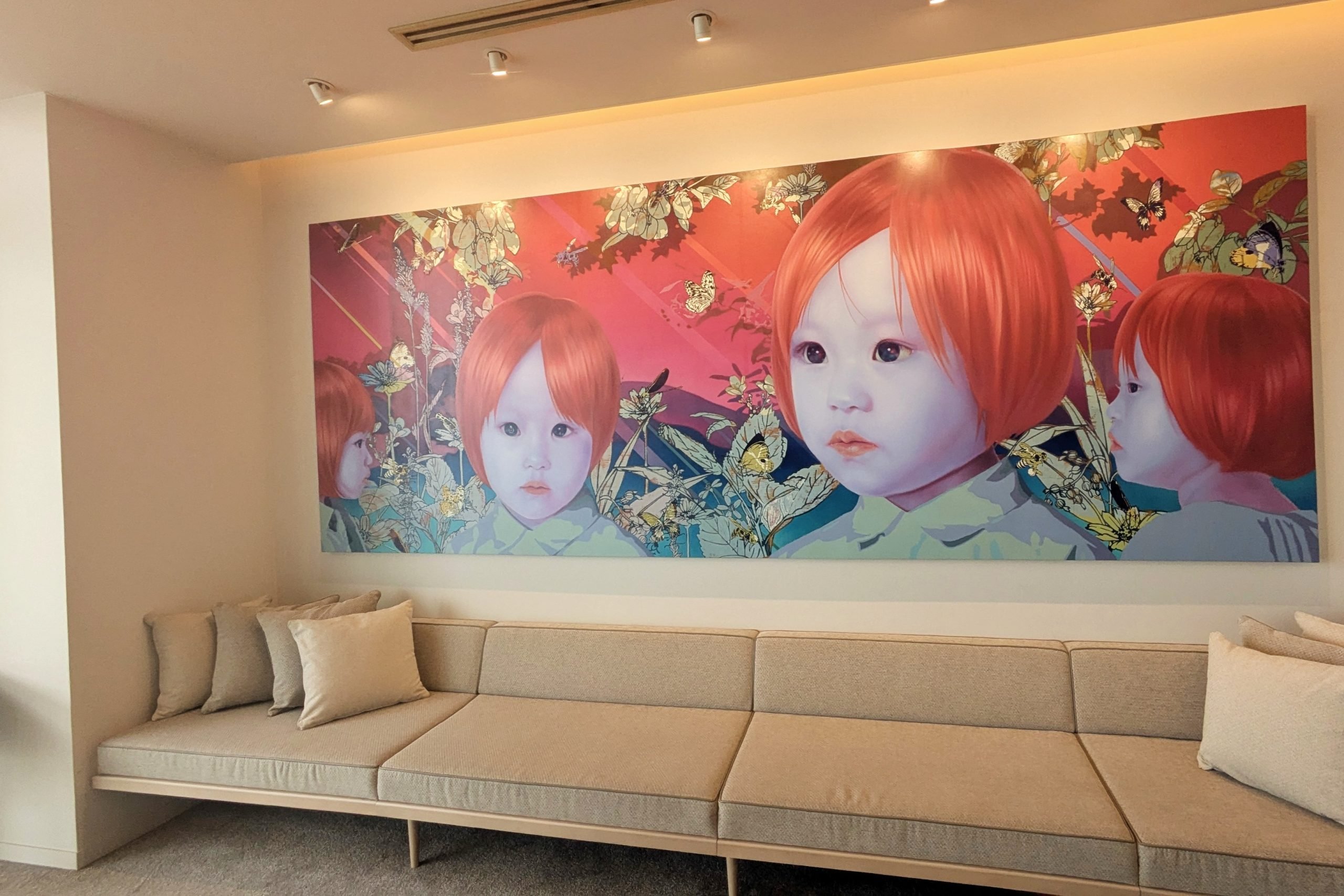 奥の壁には、赤い髪の子供を描いた品川美香さんの作品「Traveler(トラベラー)」が飾られていました。