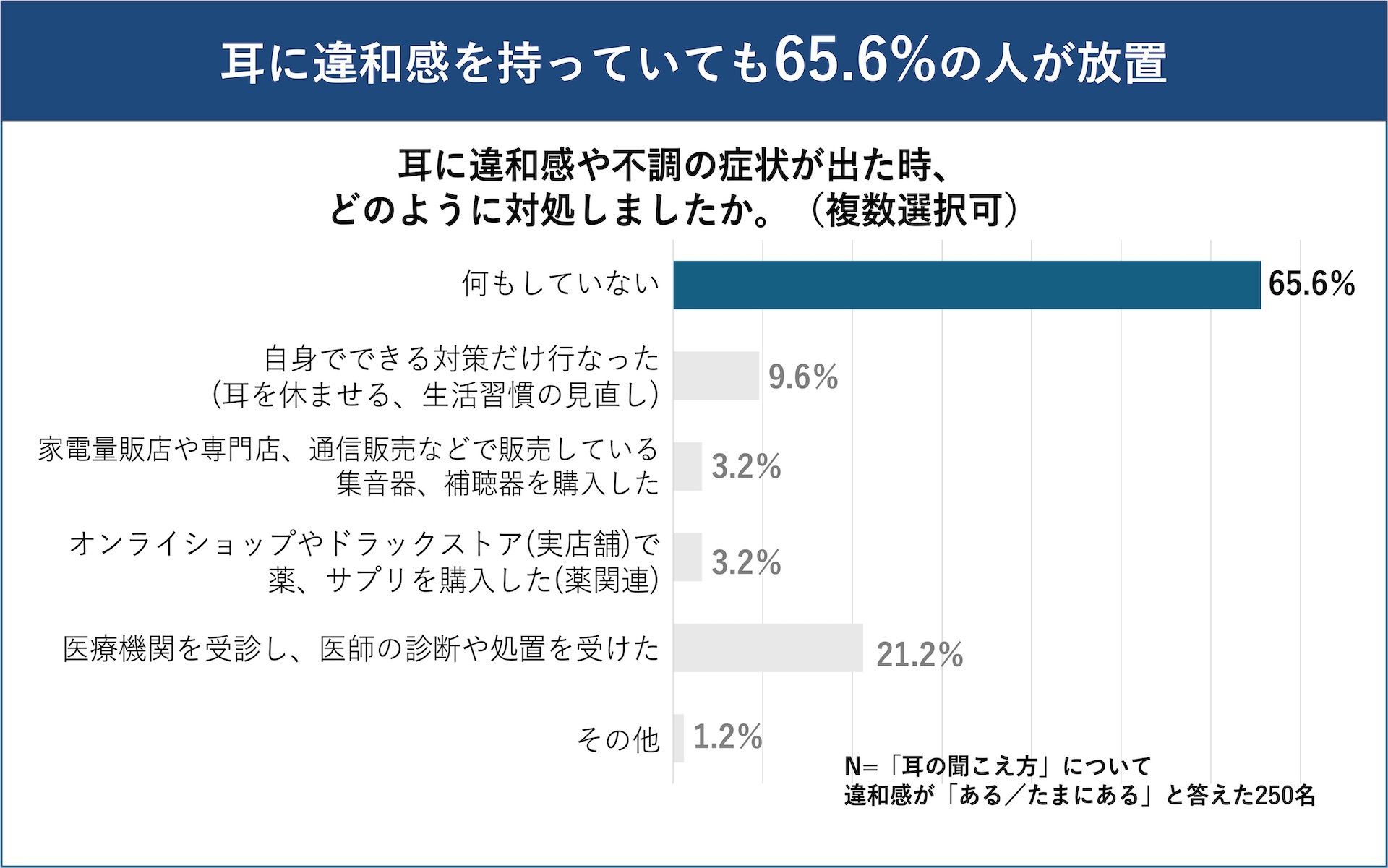 「耳の聞こえ方」について違和感を持ったことがあると回答した人に、その後の対応について尋ねると、65.6%が「特に何もしなかった」と回答しており、多くの人が耳の違和感を放置している実態が浮き彫りに。