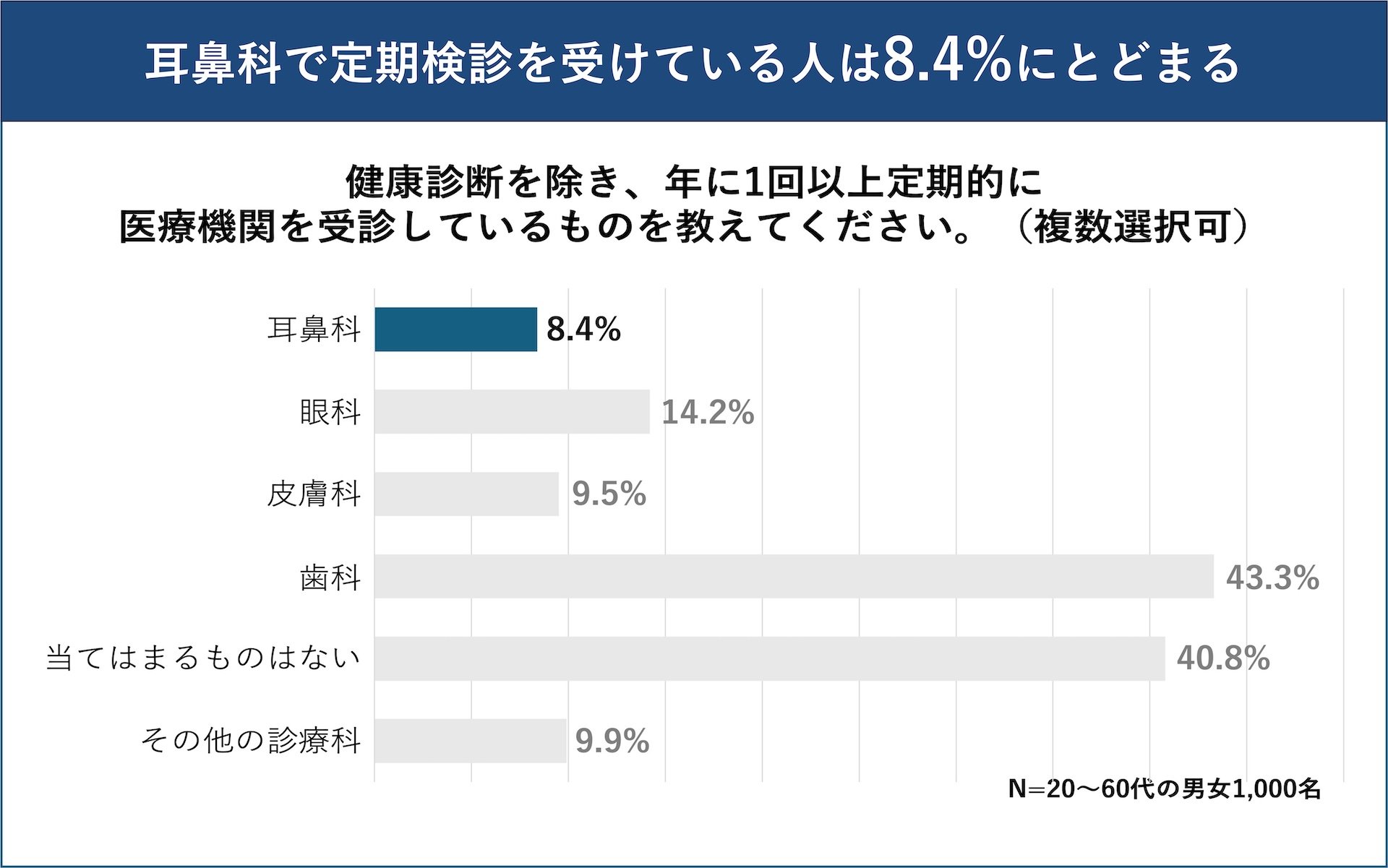 一方で、「耳鼻科」を受診している人は8.4%にとどまりました。耳は変化がわかりにくく、目につく場所でもないことから、目や歯に比べて定期的な検診は必要ないと考え、ケアが後回しにされる傾向があることがうかがえます。
