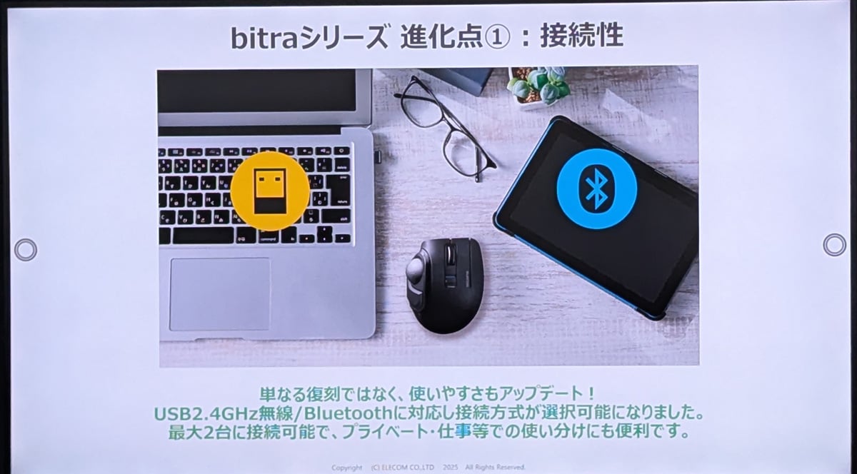 新たに、付属のUSBレシーバーを使った2.4GHz無線、Bluetoothの2方式の接続に対応。最大2大のデバイスに同時に接続できます。