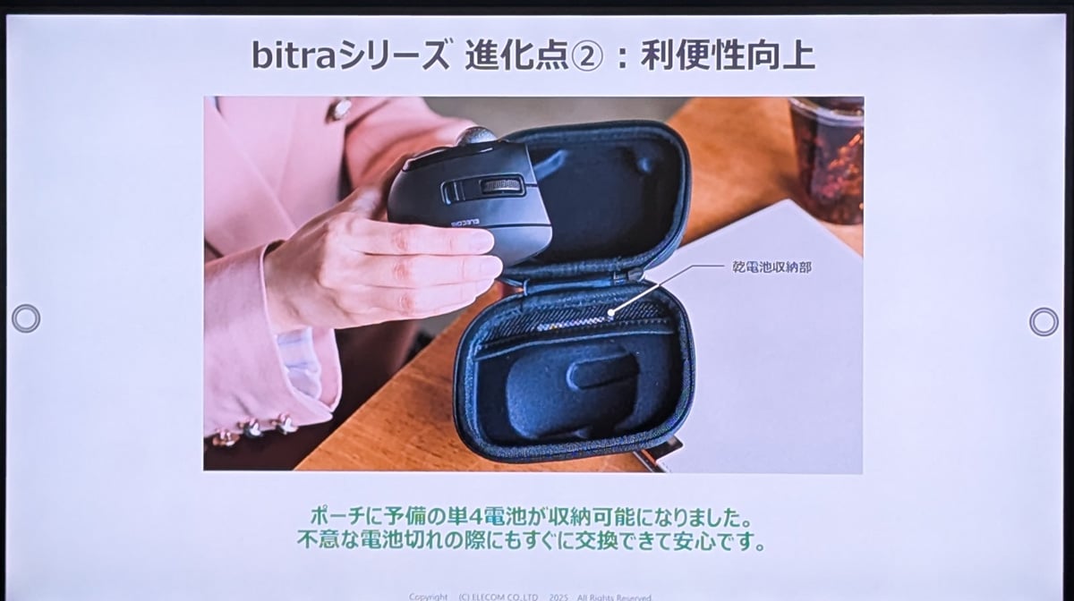 bitraは、通常モデル「M-XPT1」シリーズと比べて約30%小型化して、付属のポーチにより収納と持ち運びがしやすいコンパクトモデル。親指操作タイプと人差し指操作タイプの2タイプで、新たにホワイトカラーをラインアップした全4製品を展開します。