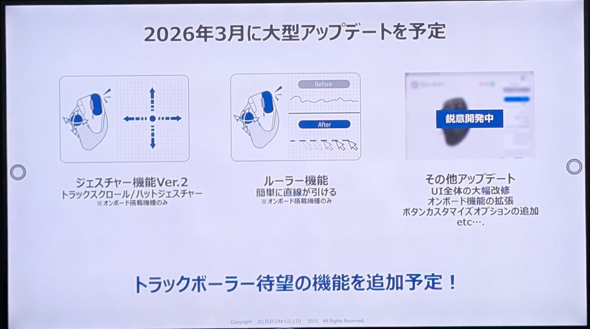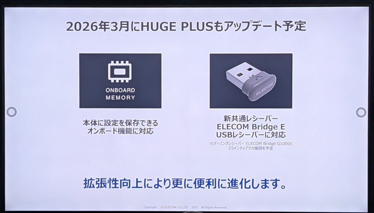 2026年3月には、エレコム マウスアシスタントの大型アップデートを予定しています。ボール操作を任意のキー入力として利用できるトラックスクロール、簡単に直線が引けるルーラー機能、UIの改修といったアップデートを提供。HUGE PLUS向けには、設定を本体に保存できるオンボード機能、共通USBレシーバー「ELECOM Bridge E」への対応を予定しています。