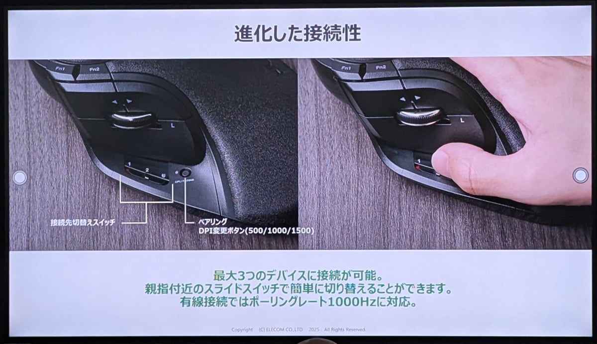 付属のUSBドングルタイプのレシーバーを使った2.4GHz無線、Bluetooth、USB有線の3種類の接続方式に対応し、各接続方式に1台ずつ、合計最大3台のデバイスを同時に接続可能。親指付近のスライドスイッチで接続デバイスを簡単に切り替えられます。有線接続ではポーリングレート1000Hzに対応し、より滑らかな操作を実現します。