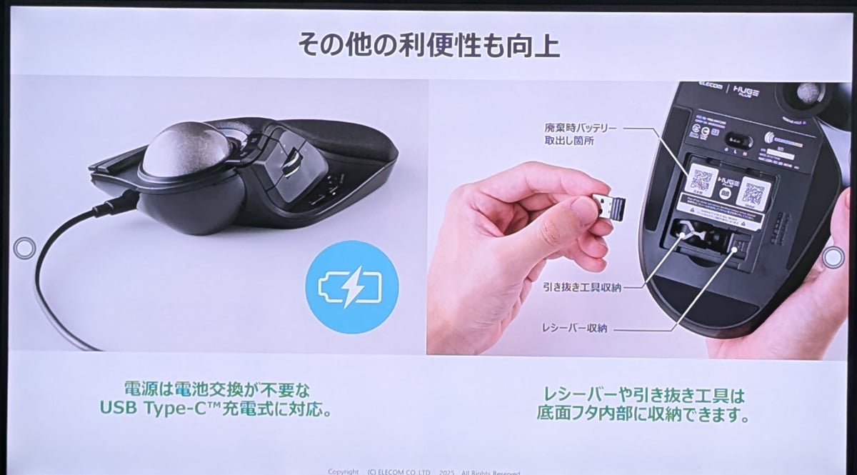 USB-Cポートから充電できる充電式で、電池交換は不要。ボールの引き抜き工具やUSBドングルを底面フタ内部に収納できるなど、利便性を向上しています。