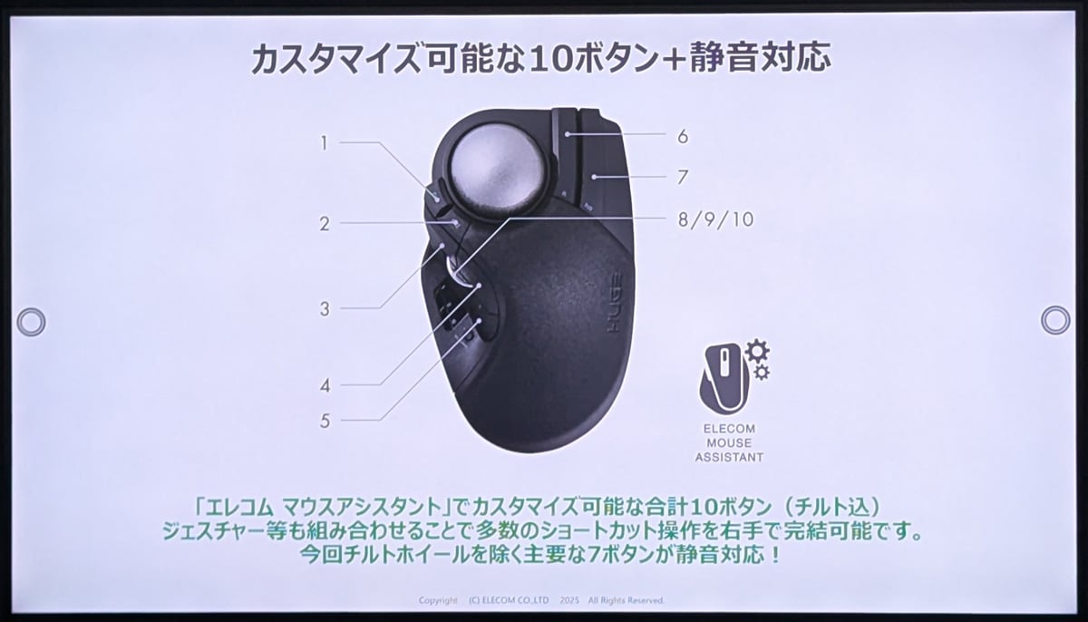 合計10個のボタンを搭載し、チルトホイールを除く主要な7ボタンは静音対応に。ボタン操作は専用ソフト「エレコム マウスアシスタント」でカスタマイズでき、ジェスチャー操作も組み合わせることで多くのショートカット操作が右手で完結します。