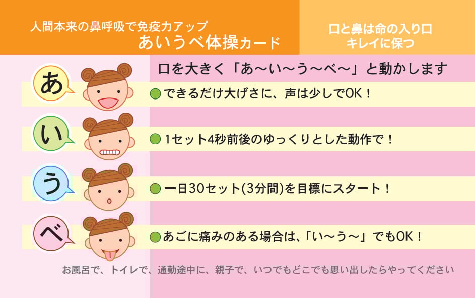 今井先生は、鼻呼吸を習慣づける方法として「あいうべ体操」を提唱しています。声は出しても出さなくてもよく、「あー」「いー」「うー」「べー」と口を大きく動かすという体操。口周りの筋肉を強化して舌を上あごの正しい位置に保つことで、口がポカンと開いてしまうことを防ぎます。1日30回ほどを目安に続けることで、3週間ほどで変化を感じる方もいるそうです。