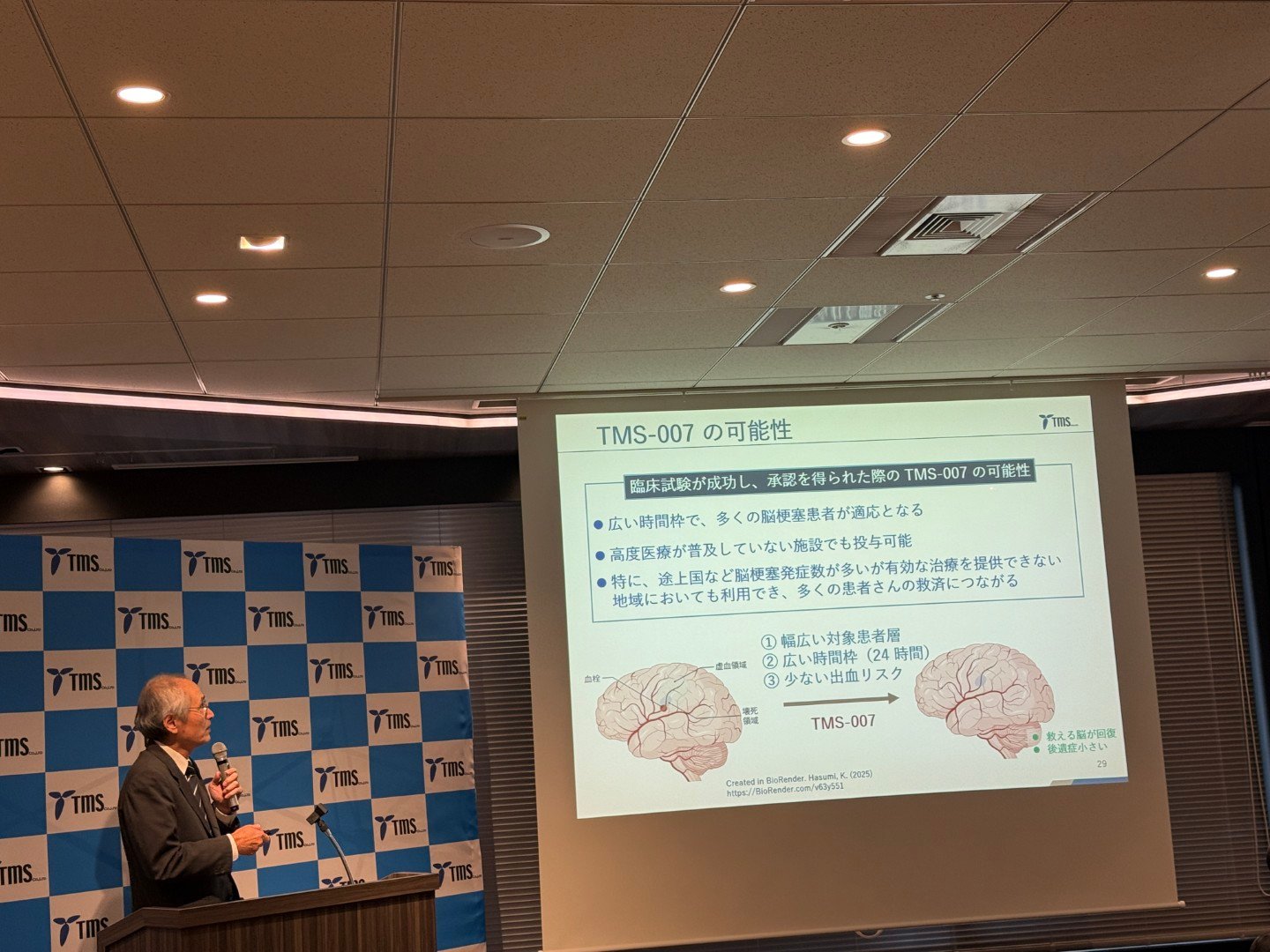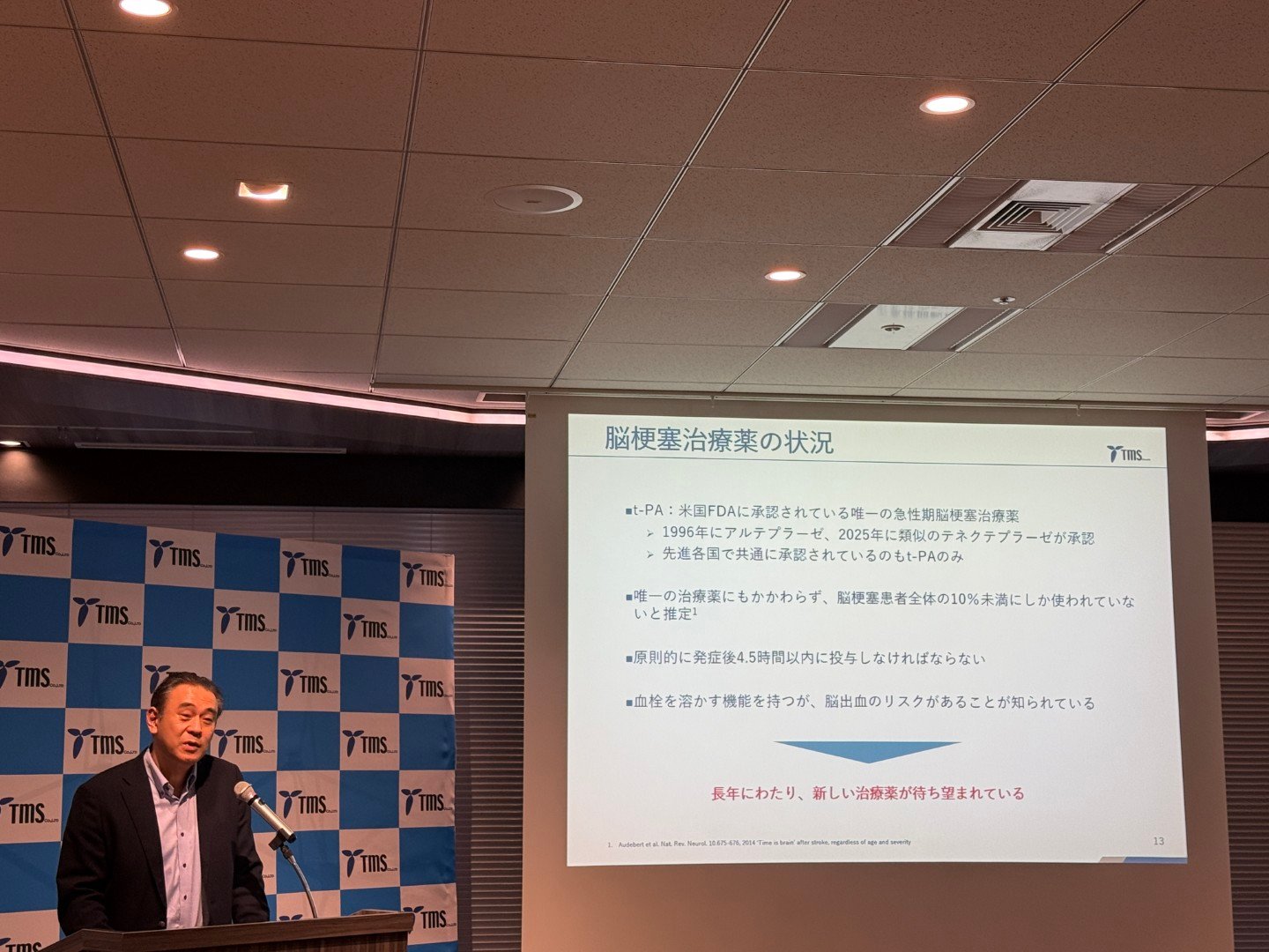 10月29日の世界脳卒中デーに合わせて、脳梗塞治療薬の新薬候補「TMS-007」を開発中の創薬ベンチャーである株式会社ティムスが、プレス向け事業説明会を開催した。そこでは、既存であり唯一である急性期脳梗塞治療薬「t-PA」の課題である発症後4.5時間以内の投与の壁を超える可能性が示されていた。