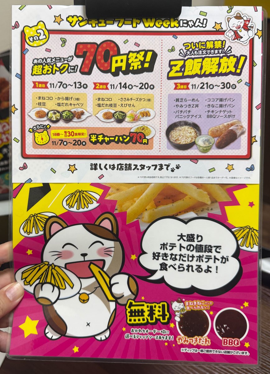 現在 #まねきねこ では、700店舗突破記念として、3週連続フードキャンペーンを開催中🐱2週目(11/14~11/20)も、あの人気メニューが70円で食べられる!?